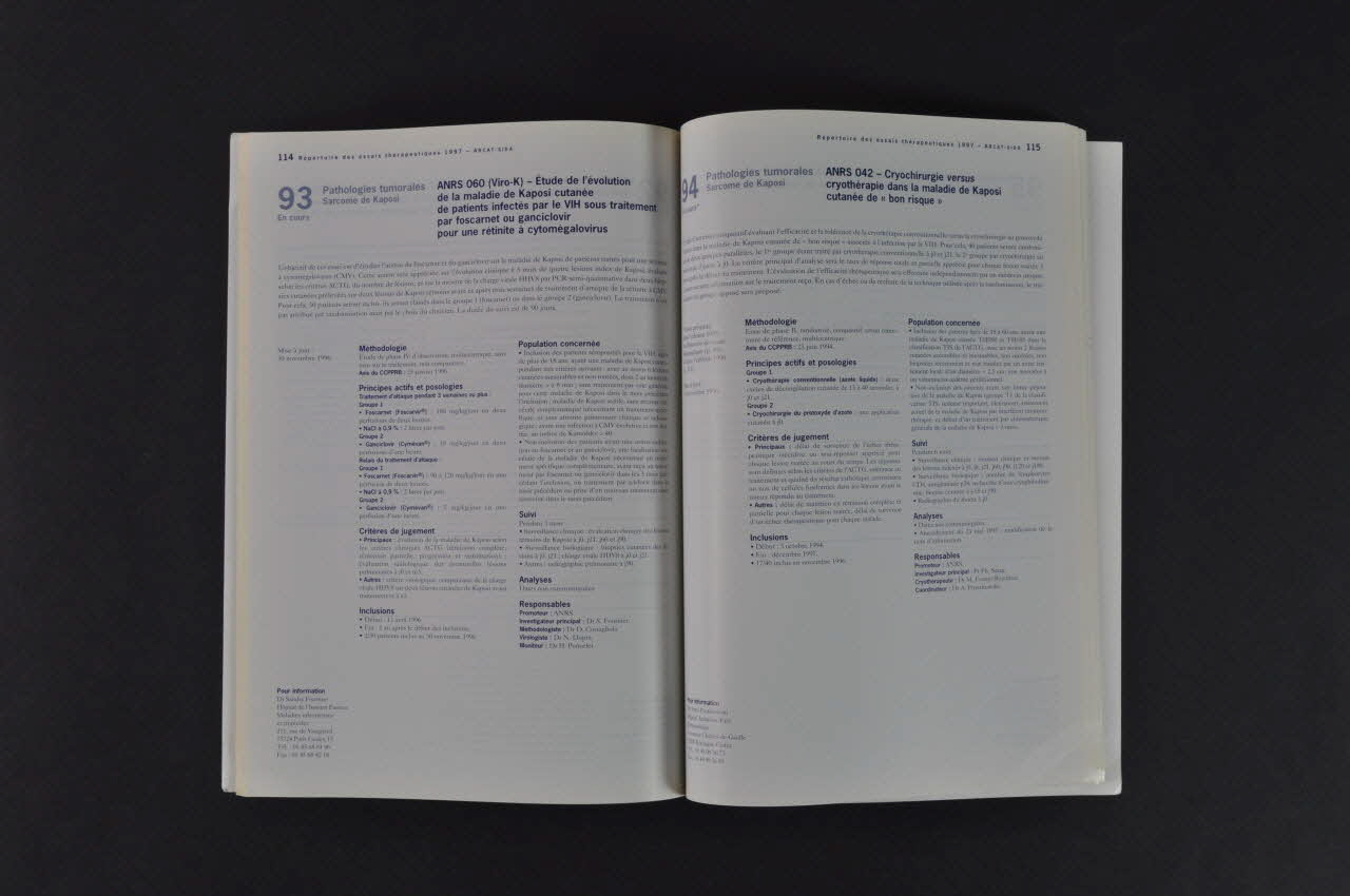 VIH et sida / Répertoire des essais / thérapeutiques en France / 5° édition 1997 (Titre sur la couverture.)- p.3 Un outil entre permanence et révolution // - p.5 Principe du traitement de l'information // - p.7 1996 : l'année des antirétroviraux // - p.13-146 Fiches essais // - p.13 Présentation des fiches essais rubriques : Nom et caractéristiques essentielles de l'essai / Méthodologie et Avis du comité consultatif de protection des personnes qui se prêtent à des recherches biomédicales (CCPPRB) / Principes actifs et Posologie / Critères de jugement / Inclusions / Population concernée / Suivi / / Analyses / Responsables ( Promoteur, Investigateur ou coordonnateur, Méthodologiste / Indépendance du comité ) / Personne à contacter // - p.15 Infection par le VIH // - p.69 Infections opportunistes // - p.105 Pathologies tumorales // - p.121 Immunothérapie / vaccins // - p.135 Autres // - p.147-194 Index : par essai / par site / par essai ANRS // - p.195-208 Adresses utiles : Comités consultatifs de protection des personnes dans la recherche biomédicale (CCPPRB) / Centres d'informations et de soins de l'immunodéficience humaine (CISIH) / Coordonnées des personnes citées / Structures institutionnelles / (Sommaire.)ANRS / L'Agence du Médicament / le Ministère de la santé / l'Union Européenne / et par les laboratoires / Bristol-Myers Squibb / Glaxo Wellcome / Roche / Pharmacia-Upjohn (Sur le demi cercle bleu clair, partenaires :)Décor