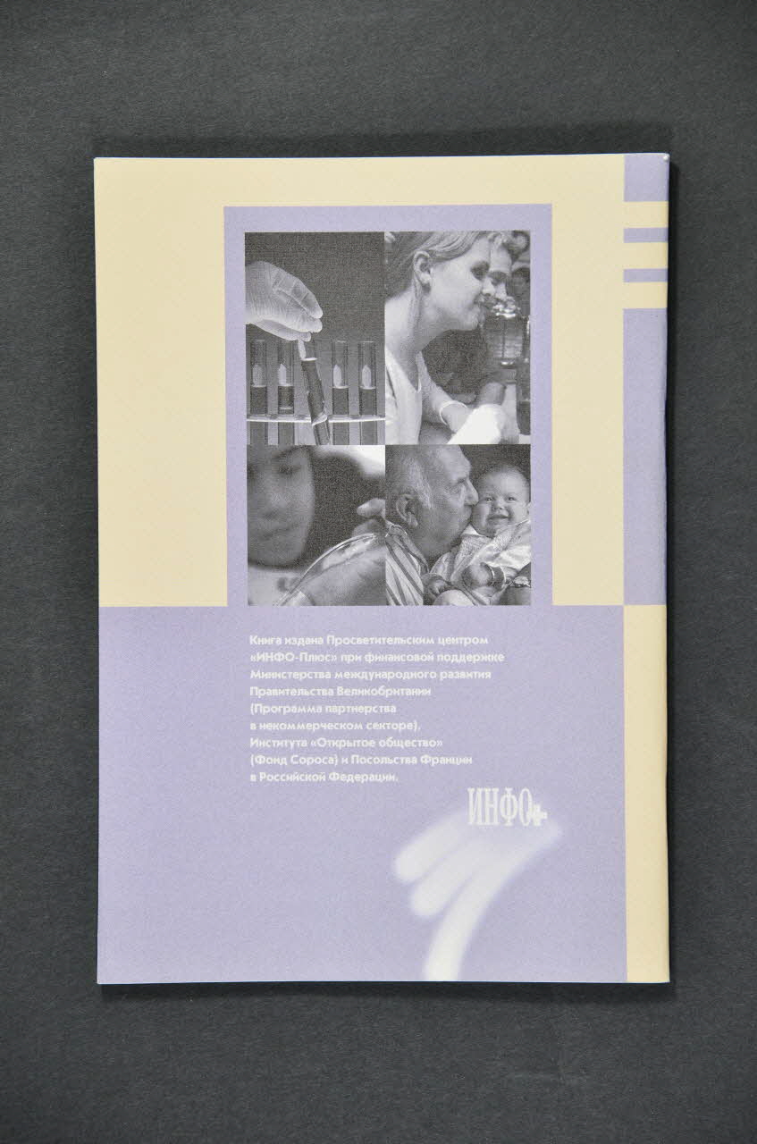 La couverture présente six photographies en noir et blanc: des tubes à essai, des femmes, un enfant perfusé, un homme et un bébé, une jeune fille, un homme. Elles sont encadrées de bandes parmes et beiges. En dessous, le titre est inscrit en caractères cyrilliques parmes sur fond beige. Au recto, on retrouve quatre des photographies encadrées de parme et de beige. En dessous, il y a un court texte en caractères blancs sur fond parme. Un logo est inscrit à la suite en blanc. L'intérieur est imprimé en noir et blanc. Sur la première page, on retrouve les six photographies au centre. Le lieu et la date d'édition sont mentionnés dans la partie inférieure.Inscriptions