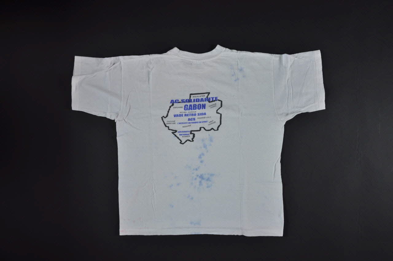 Tee shirt en toile de coton blanc, à manches courtes et encolure ronde, présentant sur la poitrine et dans le dos, une carte du Gabon avec en petites capitales noires des noms de régions. En surimpression, en bleu, le nom de l'association.Décor