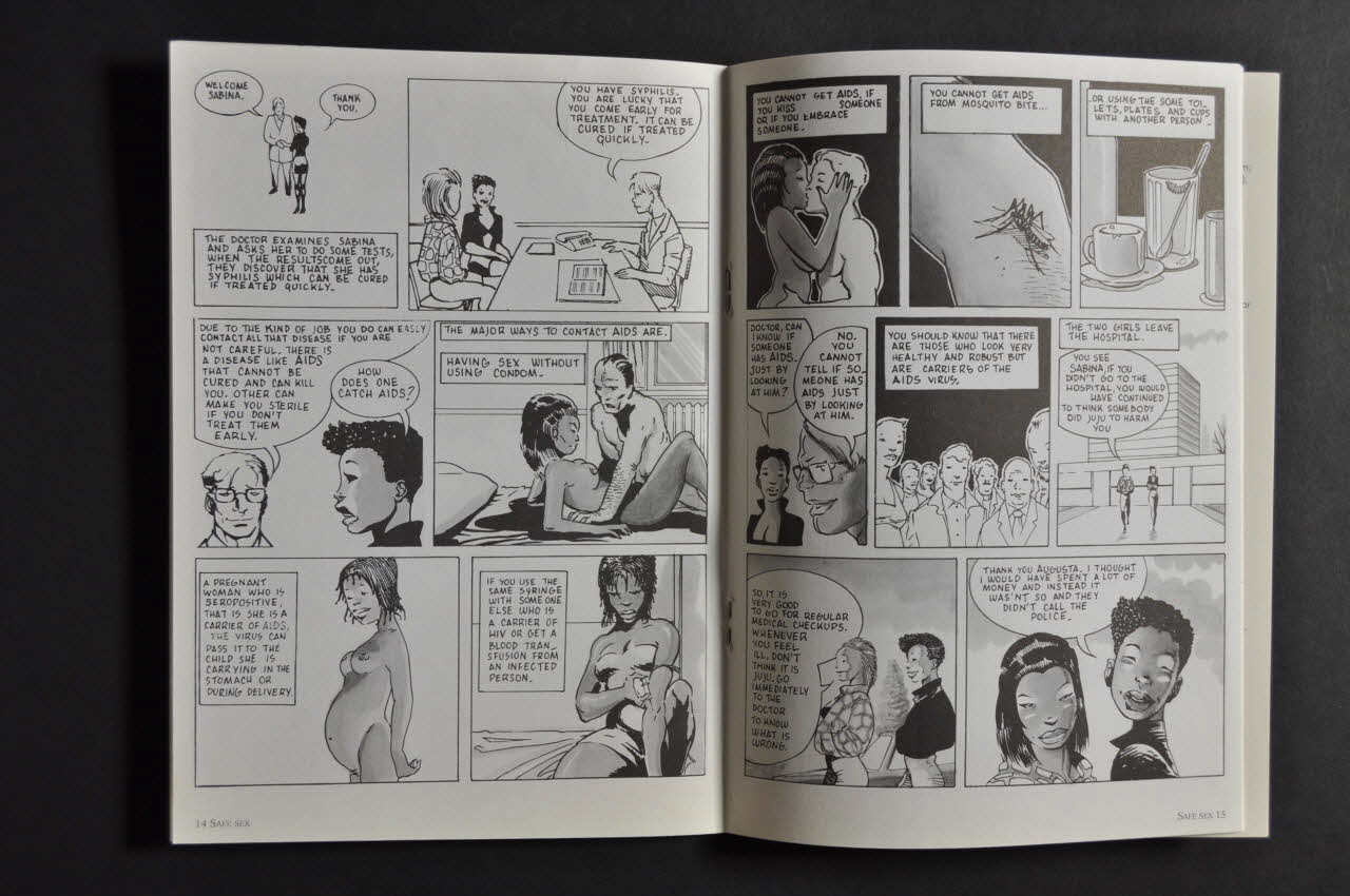 Texte en anglais destiné aux travailleuses du sexe. - p.3 : Qu'est ce qu'une maladie sexuellement transmissible : Le sida / Les autres maladies sexuellement transmissibles (sur deux colonnes) - p.4-6 : Comment s'infecte-t-on ? : Qu'en est-il du sida / Sexe sans risque et avec risque (Détail de pratiques avec petit schéma en rouge) - p.7-8 : La prévention est le soin le meilleur (préservatifs / lubrifiants /douches vaginales / travailler pendant les règles. - p.9-19 : Le chemin d'Augusta. BD en noir et blanc. Sabina, jeune femme sans papiers arivant aux Pays Bas sans être prévenur que le travail proposé serait la prostitution. A sa prelière rencontre, elle accepte de ne pas utiliser de préservatif. Augusta, une de ses compagnes lui dit qu'il ne faut pas le faire, lui parle des IST. Plusieurs mois plus tard, Sabina tombe malade, pense que c'est une question de sorcellerie due à la jalousie de ses compagnes. Augusta l'emmène à l'hôpital. Elle a la syphilis. Conseils du médecin sur ce qui transmet et ne transmet pas le sida. Autres conseils d'Augusta : comment utiliser un préservatif (5 dessins) et un lubrifiant. Les idées fausses sur les préservatifs - p.20-21 Conseils des collègues (conseils d'hygiène, 10 règles d'or pour l'usage du préservatif - p.22-23 Les tests de dépistage des IST et du sida - p.24 Grossesse et contraception - p.25-26 Lexique des IST
