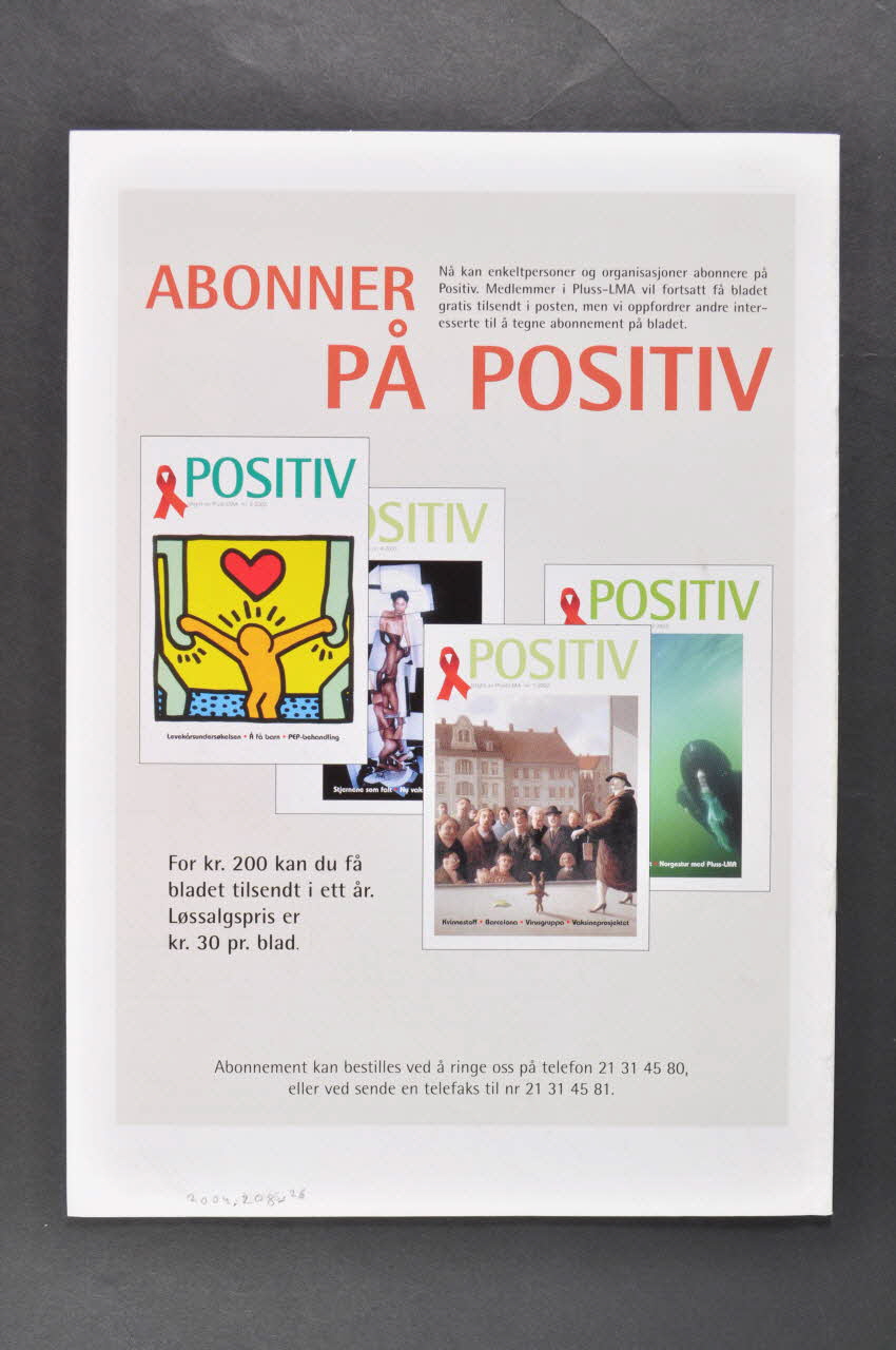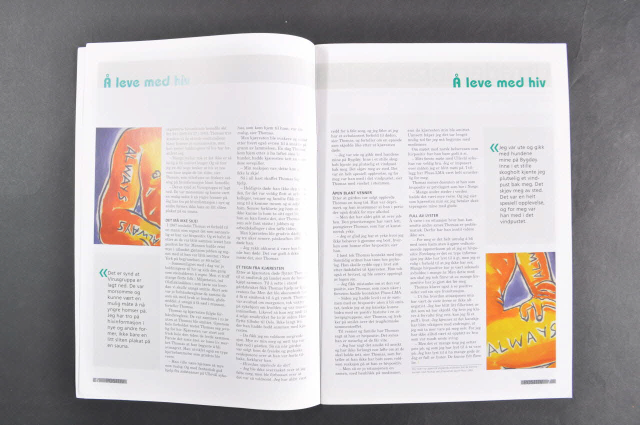 p. 5-7 Rubrique : Vivre avec le VIH : "Skjonner ikke hvordan jeg ble smittet" Article illustré par la peinture de David McDiarmid (homme assis avec +/- sur son visage en forme de carré, sexe dressé avec "Always)