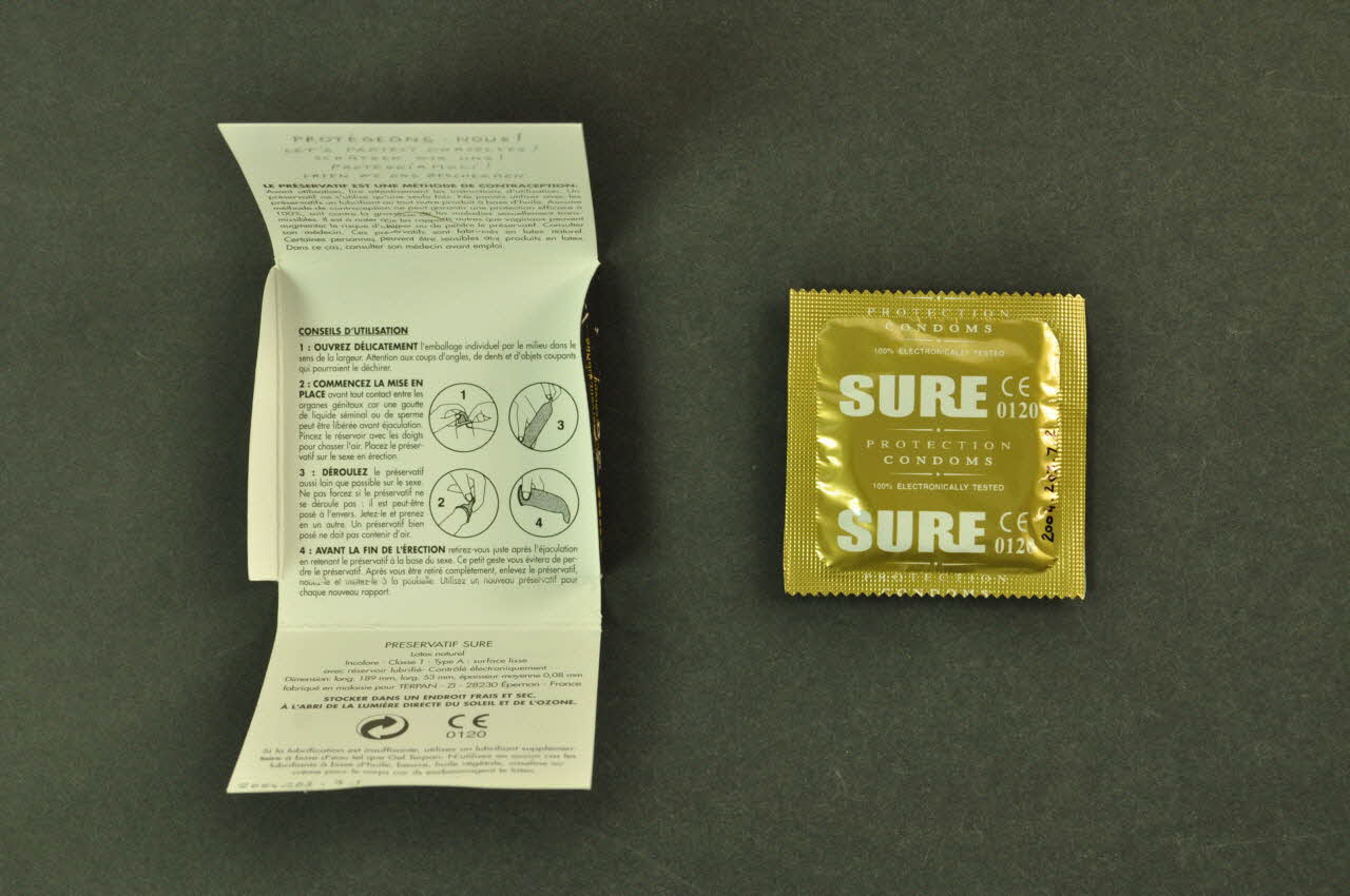 SURE // CE // 0120 // PROTECTION // CONDOMS // 100% ELECTRONICALLY TESTED // // LOT : [...] // EXP : [...] (En blanc et noir sur doré.), dessusDécor