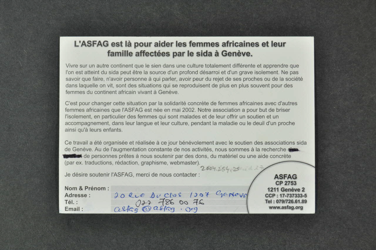 L'ASFAG est là pour aider les femmes africaines et leur // famille affectées par la sida à Genève. // Vivre sur un autre continent que le sien dans une culture totalement différente et apprendre que // l'on est atteint du sida peut être la source d'un profond désarroi et d'un grave isolement. Ne pas // savoir que faire, n'avoir personne à qui parler, avoir peur du rejet de ses proches ou de la société // dans laquelle on vit, sont des situations qui se reproduisent de plus en plus souvent pour des // femmes du continent africain vivant à Genève. // C'est pour changer cette situation par la solidarité concrète de femmes africaines avec d'autres // femmes africaines que l'ASFAG est née en mai 2002. Notre association a pour but de briser // l'isolement, en particulier des femmes qui sont malades et de leur offrir un soutien et un // accompagnement, dans leur langue et leur culture, pendant la maladie ou le deuil d'un proche // ainsi qu'à leurs enfants. // [...] (Au verso, en lettres noires sur fond blanc), versoaccompagnement // solidarité // accueil // soutien // infos (Sur le recto, autour de la carte de l'Afrique, en sousimpression de couleur verte), rectoAdresse