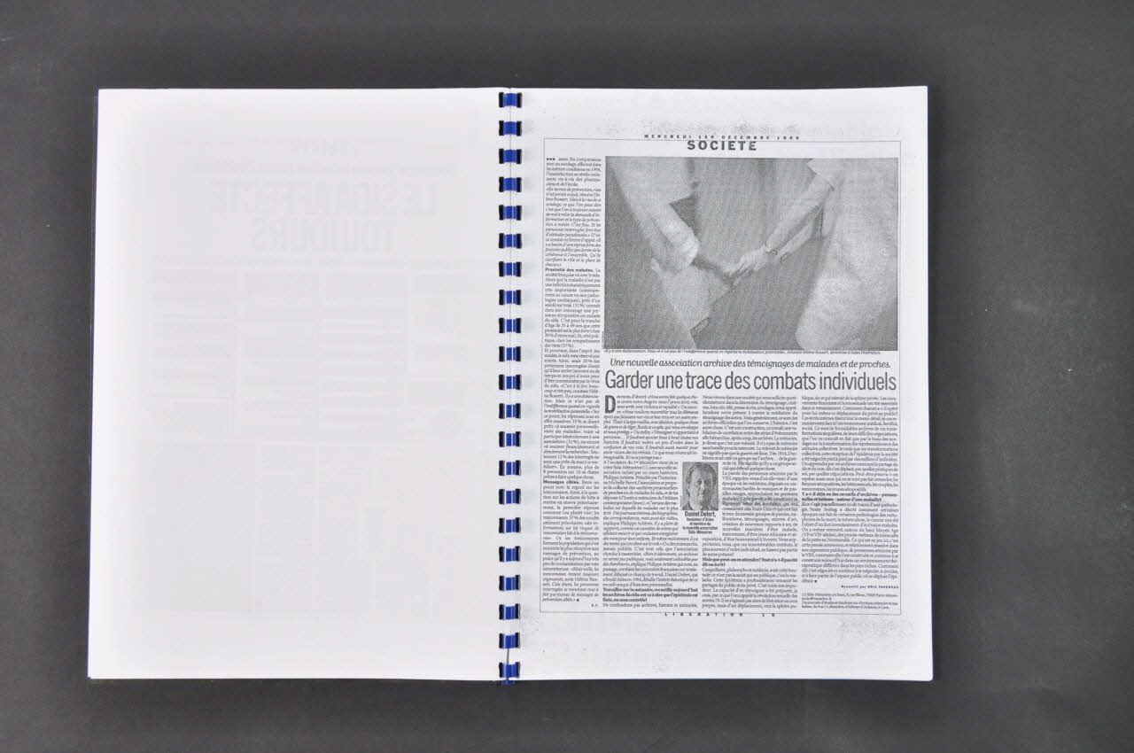 Sur la couverture se trouvent le logo de l'association, le titre, une date et, dans le bas, de petits caractères noirs donnant des précisions sur l'association. Une feuille plastique transparente de protection est placée devant. Le dos est constitué d'une feuille texturée et cartonnée bleue. A l'intérieur, les pages sont imprimées sur le recto uniquement et reproduisent des articles issus de la presse.Inscriptions