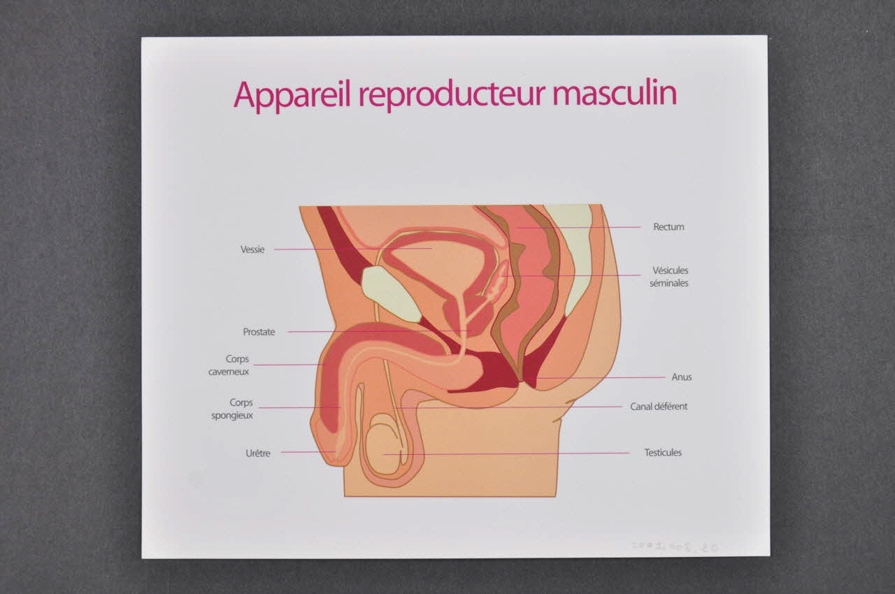 Il s'agit d'une planche anatomique imprimée sur du papier cartonné glacé blanc, composée de deux faces sur lesquelles se trouvent respectivement un dessin légendé de l'extérieur de l'appareil reproducteur masculin, et un autre de la vue intérieure du même appareil. Le titre de la représentation se trouve au-dessus du dessin, sur chaque face.Inscriptions