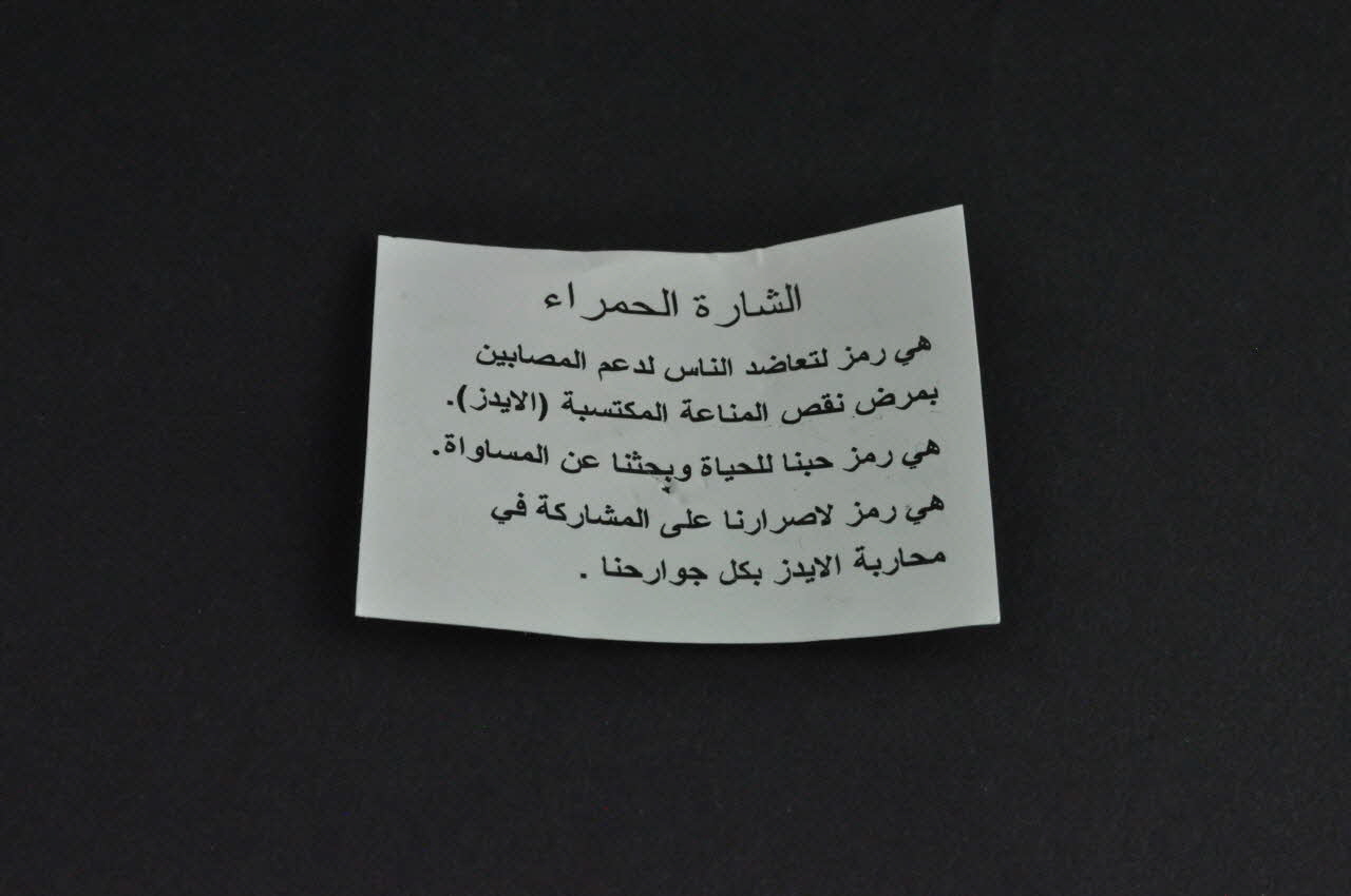 Métal moulé émaillé. / Pin's en métal doré, prenant la forme d'un ruban rouge bordé de doré. Le bout de chaque pan est légèrement arrondi. Jointe au pin's une petite étiquette en papier blanc, présentant des inscriptions bilingues : un côté en arabe, un autre en anglais avec la signification du ruban rouge.Décor