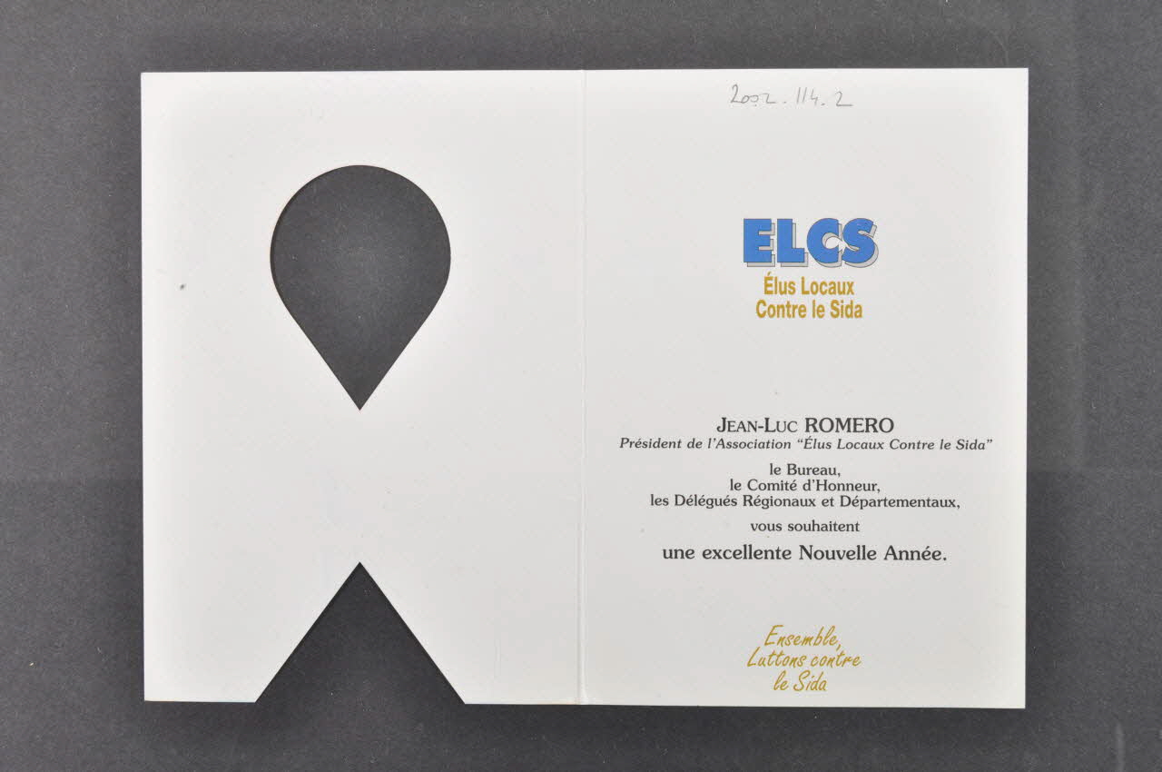 ELCS // Elus Locaux Contre le Sida // // Jean-Luc ROMERO // Président de l'Association "Elus Locaux contre le Sida" // // le Bureau, // le Comité d'Honneur, // les délégués Régionaux et Départementaux, // // vous souhaitent // une excellente Nouvelle Année. // Ensemble, Luttons contre le sida (intérieur)Logo, adresse, nom d'association