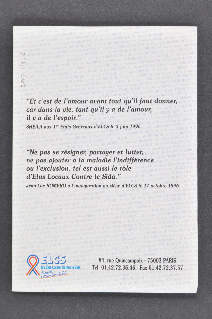 "Et c'est de l'amour avant tout qu'il faut donner, car dans la vie, tant qu'il y a de l'amour, il y a de l'espoir." // Sheila aux 1ers Etats Généraux d'ELCS le 3 juin 1996 // // "Ne pas se résigner, partager et lutter, ne pas ajouter à la maladie l'indifférence ou l'exclusion, tel est aussi le rôle d'Elus Locaux Contre le Sida." // Jean-Luc Romero à l'inauguration du siège d'ELCS le 17 octobre 1996, versoDécor