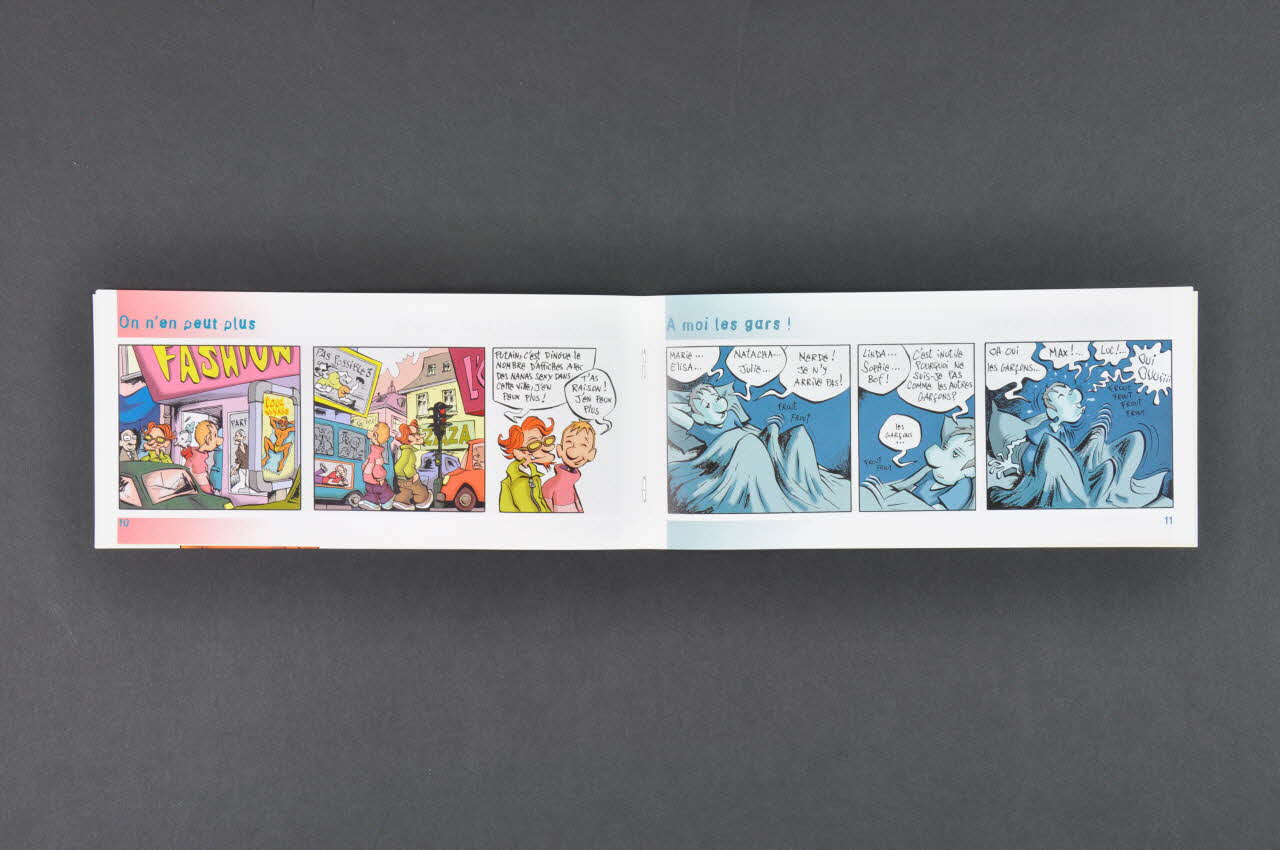 La couverture présente un fond bleu clair et le dessin en style bande dessinée d'un garçon ayant l'air interrogatif, avec derrière lui, deux garçons de dos se tenant par l'épaule. Dans la partie supérieure, le titre est inscrit en lettres bleues. Dans l'angle inférieur droit, se trouve un sous-titre en lettres oranges dans un encart bleu foncé. Le verso se compose d'un fond blanc et d'une bande bleue verticale à droite. Au centre, en caractères bleus et rouges, sont listés les collaborateurs du projet. Dans la partie inférieure droite, sont inscrits les logos de l'éditeur Ex Aequo et du Ministère de la Communauté Française. La page deux présente le dessin du même personnage se questionnant un doigt sur la bouche, avec à sa droite un slogan en capitales rouges sur fond blanc. Le prix dans l'angle inférieur droit a été volontairement rayé au marqueur noir. L'intérieur présente des pages de bandes dessinées entrecoupées de pages de texte sur fond blanc en caractères rouges et bleus. Le logo de Ex Aequo est présent dans l'angle inférieur droit de la troisième page. Les deux dernières pages mentionnent une liste d'adresses.Inscriptions