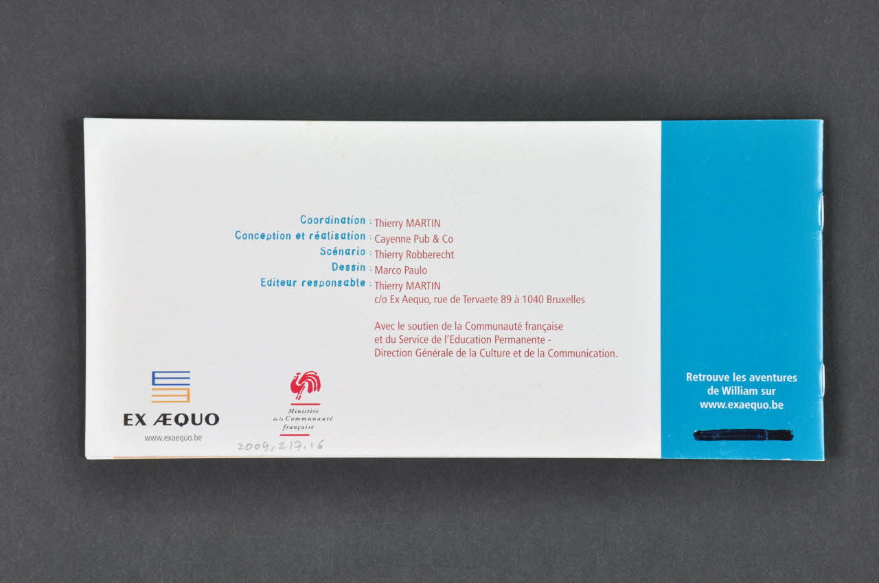 EX AEQUO // www.exaequo.be (Dans l'angle inférieure gauche, en caractères noirs, deux "E", chacun dans un sens, en bleu ou en orange. On le retrouve sur la troisième page.), versoSous-titre