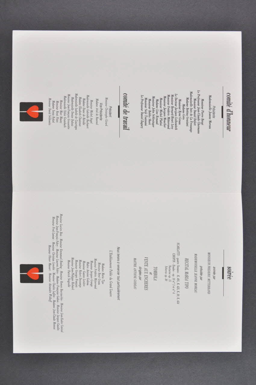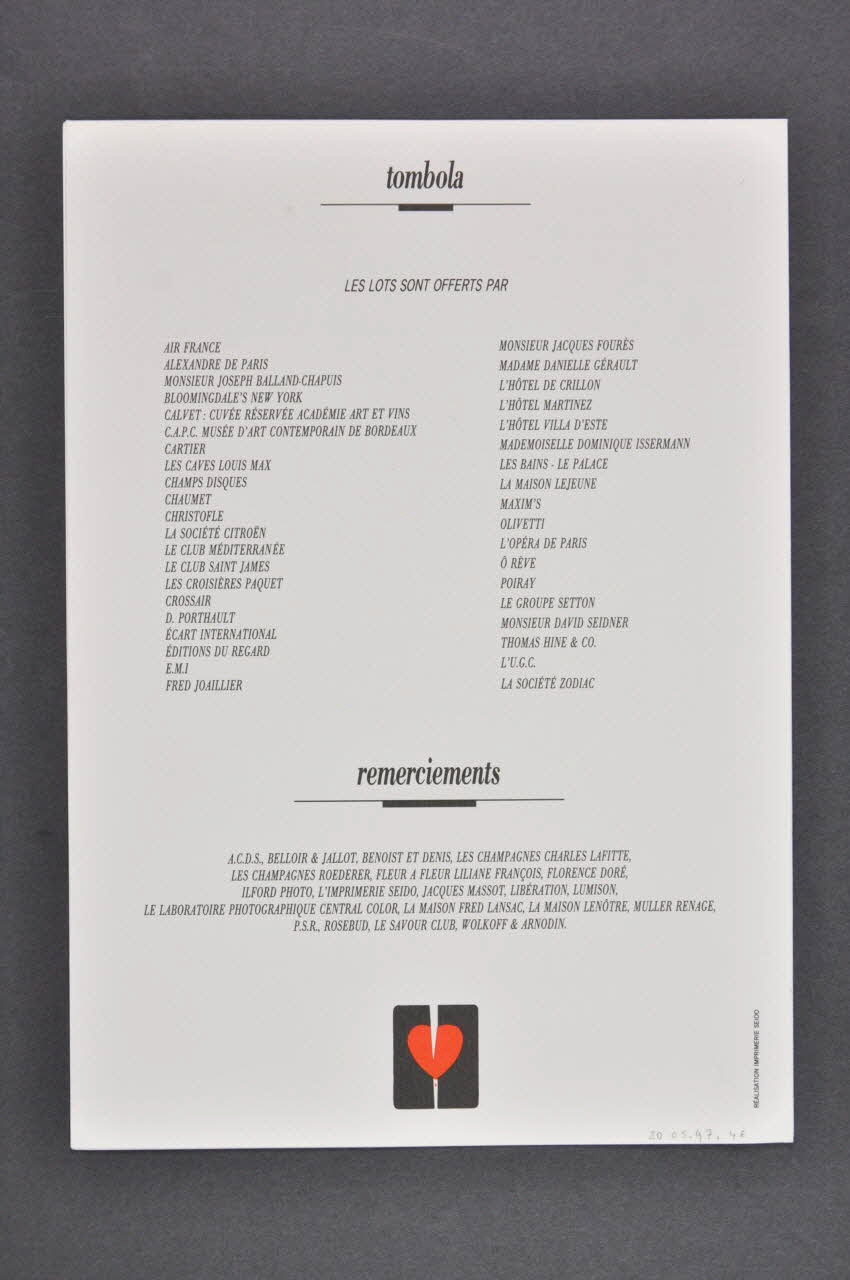 Ce carton d'invitation est imprimé sur une feuille de papier blanc cassé rectangulaire plié en deux parties avec des impressions noires. Seul le logo présent au centre de la couverture, et répétés en bas de chaque page, comporte un coeur entrouvert saignant rouge sur un rectangle aux bords arrondis noir coupé en deux. Il s'agit d'une invitation pour une soirée de charité organisée par les couturiers et créateurs de mode.