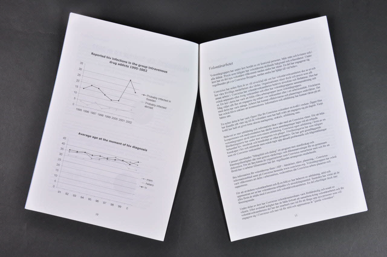 Liste des titres : - Convictus mycket dynamik men utan trygghet - Förening med egen profil - Lokalproblemen, Convictus huvudvärk - Tankar frän äret som gyck - Ökande internationellt arbete : quelques lignes de présentation de l'association en anglais : aide aux personnes séropositives usagères de drogues et aux sans abri. Hébergements pour les sans abri dont certains sont séropositifs. Actions de Convictus en Estonie, en Lituanie et à St Petersbourg. - Données épidémiologiques pour la Suède en 2002. - Volontärarbetet - Tomtebo - rekreation för hemlösa och hivpositiva - Längsiktig inriktning - Värvning av volontärer - reproduction d'articles sur l'association.