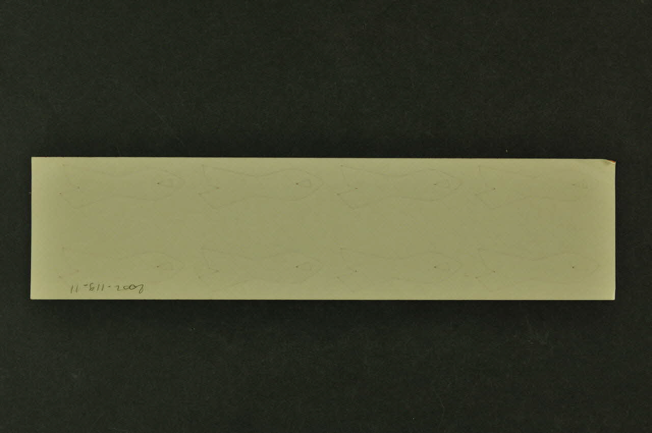 Huit autocollants en forme de ruban rouge encollés sur un papier rectangulaire, de format vertical, sur quatre rangées de deux.Décor
