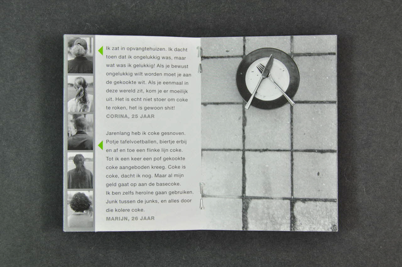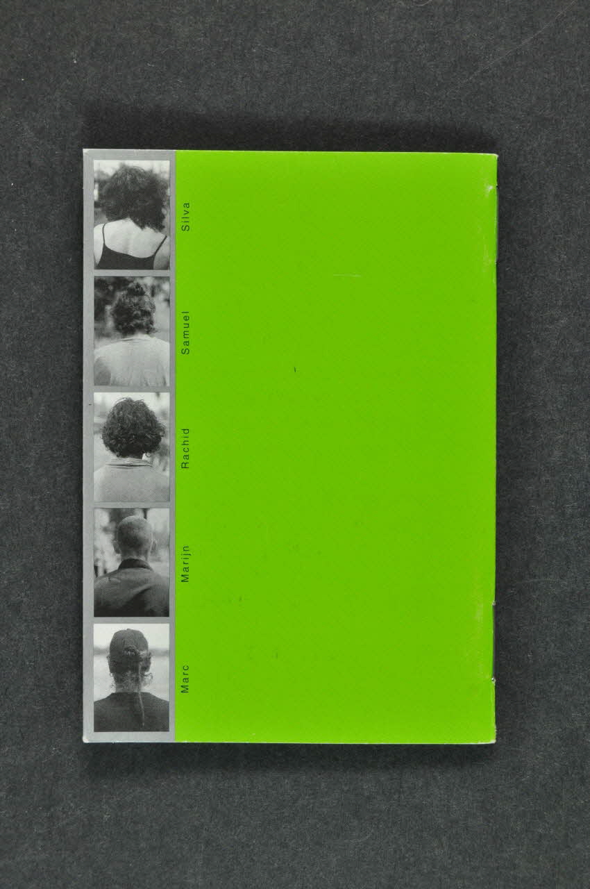 Marc // Marijn // Rachid // Samuel // Silva (nom des personnes prises en photo ; inscription en noir sur fond vert à droite de la bande verticale grise au dos du dépliant), versoJoost // Joyce // Corina // Mirjam // Chen (nom des personnes prises en photo ; inscription en noir sur fond vert à gauche de la bande verticale grise), sur la couvertureDécor