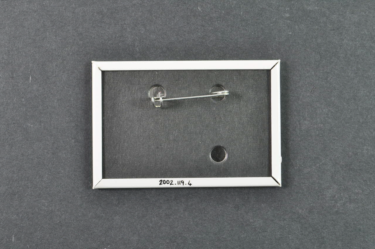 Badge rectangulaire, en métal, dont le dos, pourvu d'une épingle métallique, est couvert d'un épais carton noir. Le badge est recouvert de papier blanc plastifié, présentant des inscriptions.