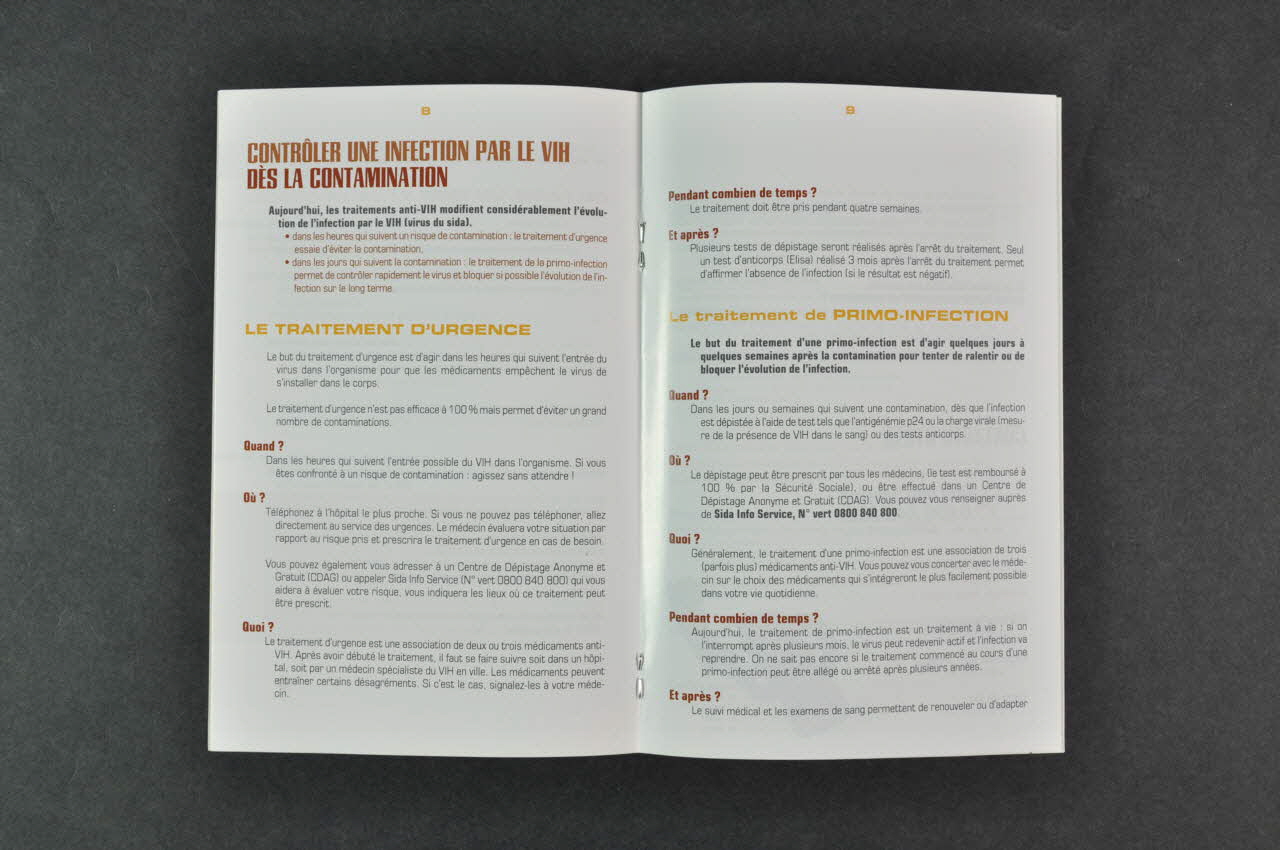 Introduction // // Les premiers secours // L'antisepsie, le premier des soins // Les circonstances de l'exposition : des détails importants // La déclaration d'accident du travail. // // Le dépistage du sida // Quand faire le test ? // Où faire le test ? // // Contrôler une infection par le VIH dès la contamination // Le traitement d'urgence // Le traitement de primo-infection // // Contacts utiles, à l'intérieurLogo, nom d'association