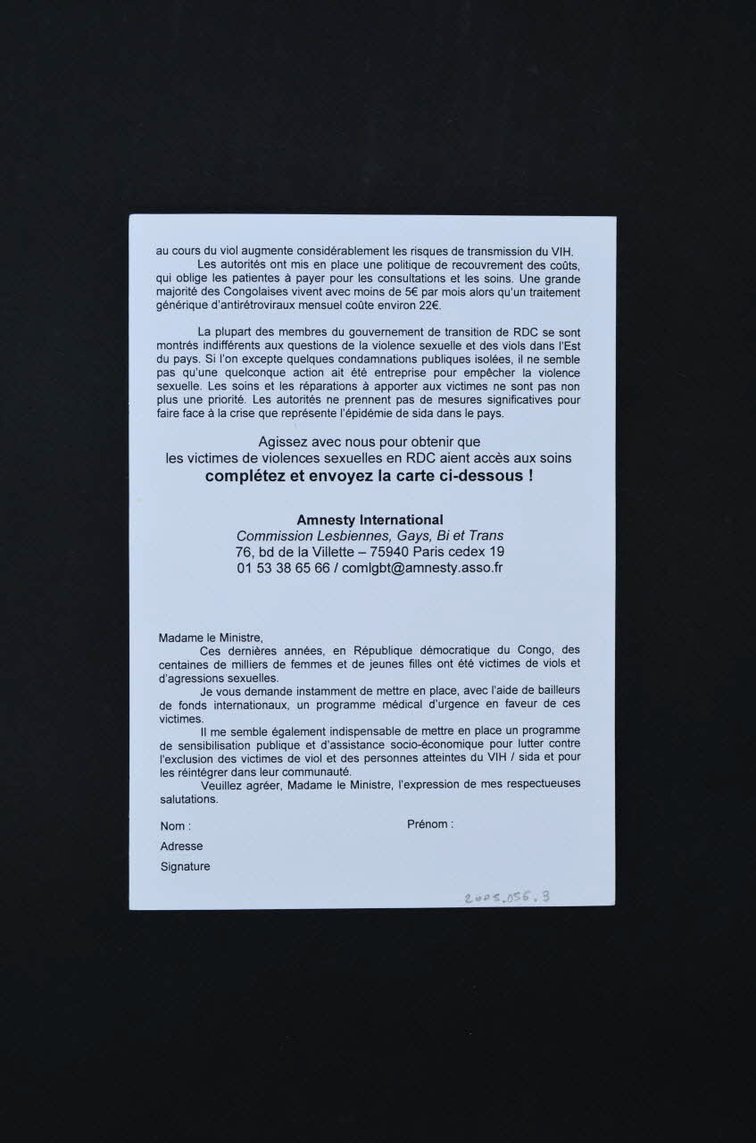 Madame le Ministre // Ces dernières années, en République Démocratique du Congo, des centaines de milliers de femmes et de jeunes filles ont été victimes de viols et d'agressions sexuelles. // Je vous demande instamment de mettre en place, avec l'aide de bailleurs de fonds internationaux, un programme médical d'urgence en faveur de ces victimes. // Il me semble également indispensable de mettre en place un programme de sensibilisation publique et d'assistance socio-économique pour lutter contre l'exclusion des victimes de viol et des personnes atteintes du VIH/sida et pour les réintégrer dans leur communauté. // Veuillez agréer, Madame le Ministre, l'expression de mes respectueuses salutations (en bas), versoEn dessous, le texte : "En République Démocratique du Congo (RDC), le viol est utilisé de manière délibérée et stratégique comme arme de guerre. Beaucoup de femmes souffrant de blessures ou de maladies causées par le viol - dont le VIH/sida - n'ont pas accès aux soins médicaux dont elles ont besoin. Amnesty International demande instamment au gouvernement de la RDC et à la communauté internationale de mettre en oeuvre les mesures essentielles pour faciliter l'accès des victimes de viol aux soins. // Dans un pays où des millions de civils souffrent et meurent de blessures et de traumatismes causés par de nombreuses années de conflit, les infrastructures du secteur de santé, qui souffraient déjà d'un grave manque d'investissements, se sont complètement effondrées dans de nombreuses régions. Les centres de soins ne peuvent même pas offrir les traitements les plus élémentaires. Le produit des ressources naturelles a été utilisé pour 'soutenir l'effort de guerre' plutôt que pour le secteur de la santé. // Depuis le début du conflit, l'une des grandes sources de préoccupation a été l'augmentation spectaculaire du VIH/sida dans les provinces les plus touchées par le viol. La destruction des tissus génitaux lors des violences infligées au cours du viol augmente considérablement les risques de transmission du VIH. // Les autorités ont mis en place une politique de recouvrement des coûts, qui oblige les patientes à payer pour les consultations et les soins. Une grande majorité des Congolaises vivent avec moins de 5 ¤ par mois alors qu'un traitement générique d'antirétroviraux mensuel coûte environ 22 ¤. // La plupart des membres du gouvernement de transition de RDC se sont montrés indifférents aux questions de la violence sexuelle et des viols dans l'Est du pays. Si l'on excepte quelques condamnations publiques isolées, il ne semble pas qu'une quelconque action ait été entreprise pour empêcher la violence sexuelle. Les soins et les réparations à apporter aux victimes ne sont pas non plus une priorité. Les autorités ne prennent pas de mesures significatives pour faire face à la crise que représente l'épidémie de sida dans le pays. // Agissez avec nous pour obtenir que les victimes de violences sexuelles en RDC aient accès aux soins. Complétez et envoyez la carte ci-dessous ! (et verso, en haut), rectoTitre