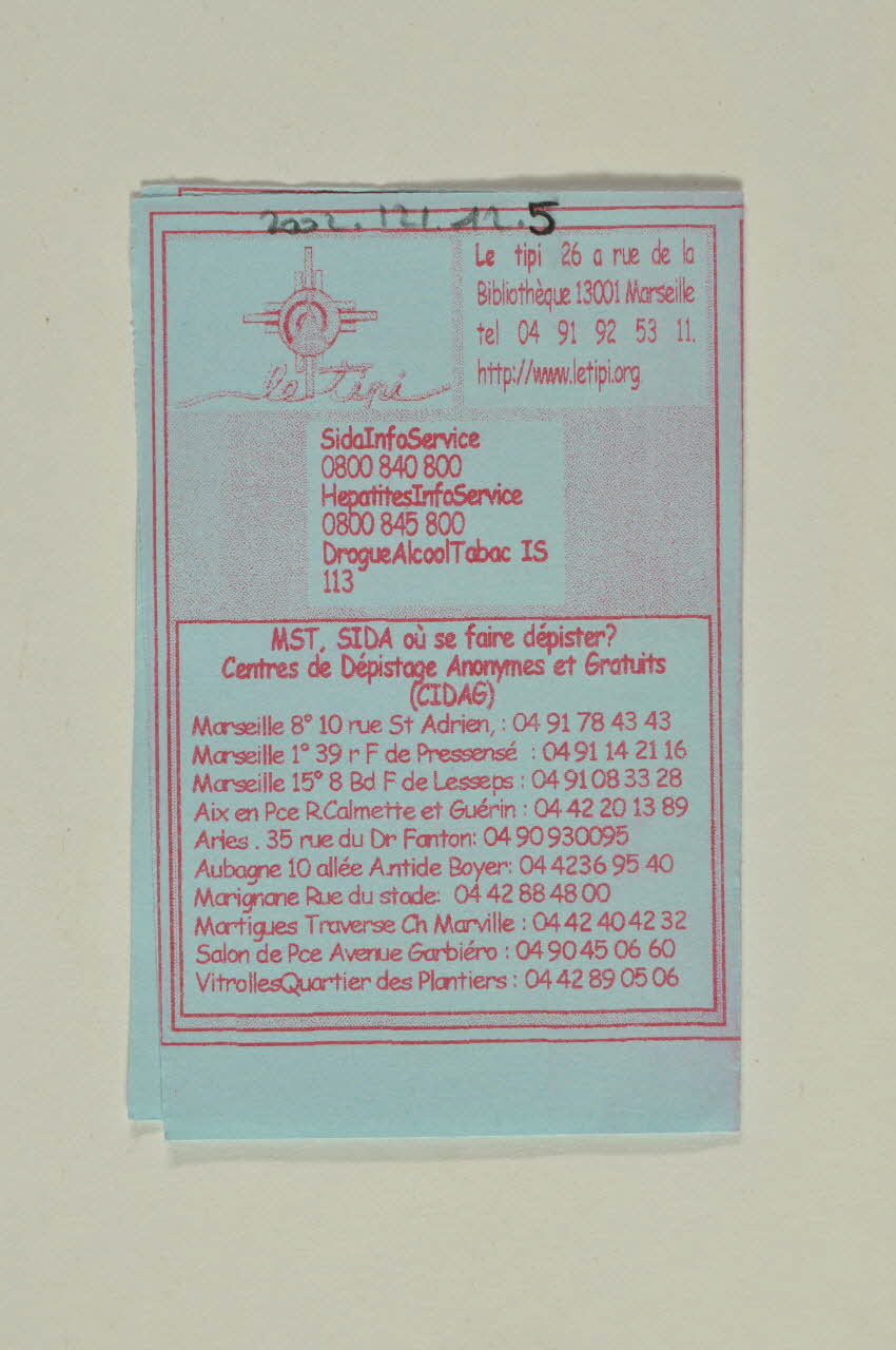 Papier de couleur bleue imprimé et plié en deux pour former un petit flyer rectangulaire.L'ensemble présente des textes en rouge dans des cadres. Sur les faces avant et arrière se trouvent deux logos.Inscriptions