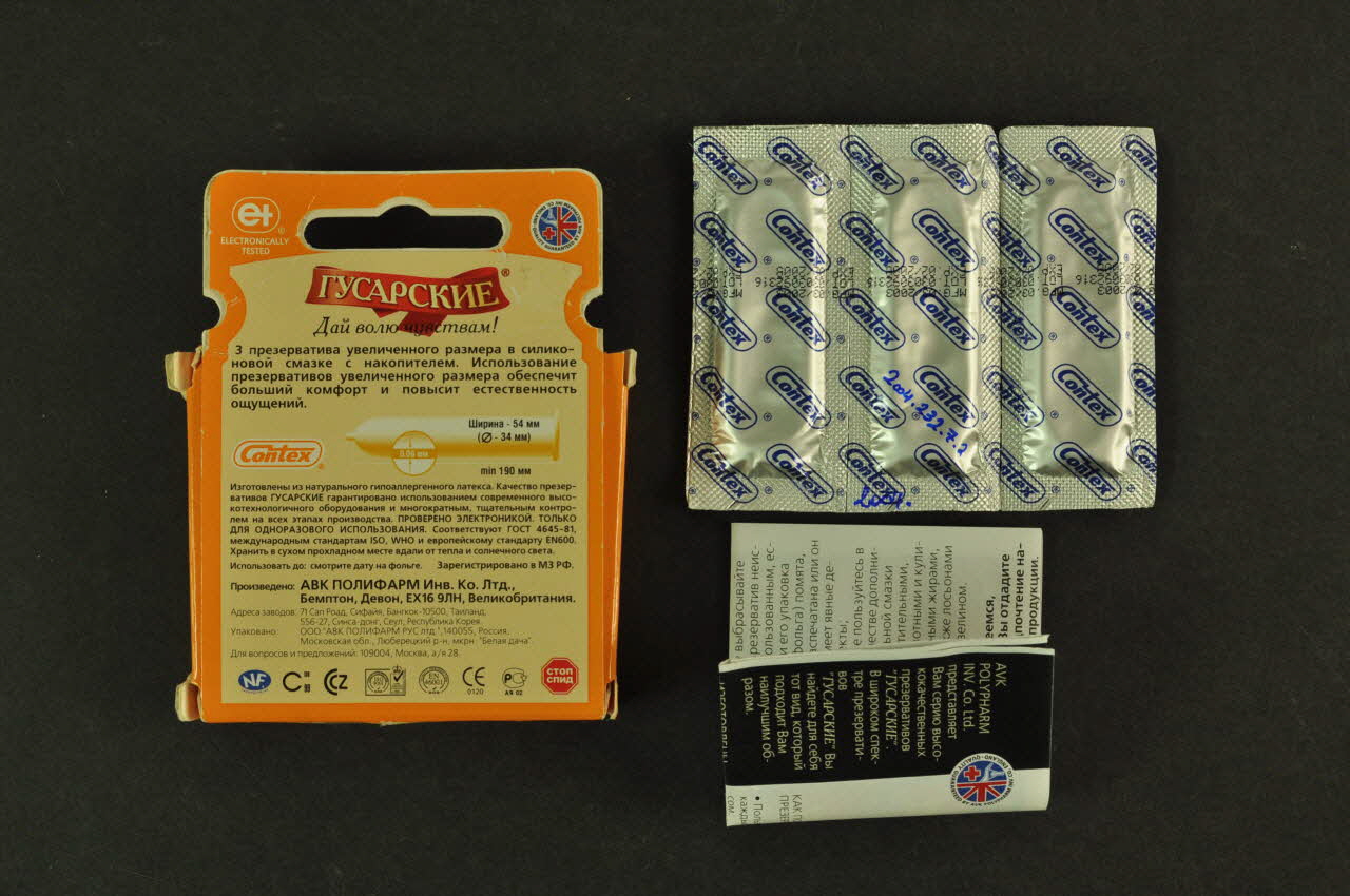 En haut, en lettres un peu en relief jaune clair sur pancarte rouge, il y a une inscription en caractères cyrilliques. En dessous on trouve des inscriptions en caractères cyrilliques, et au centre la marque. A côté de celle-ci il y un dessin d'un préservatif.