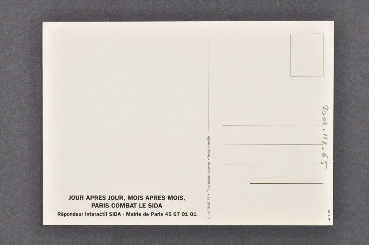 Le recto est une inscription blanche sur fond noir, avec une petite photographie d'un préservatif rose en bas. Le verso est séparée par une ligne verticale ; la zone de droite est lignée pour l'adresse, avec un cadre pour le timbre.Inscriptions