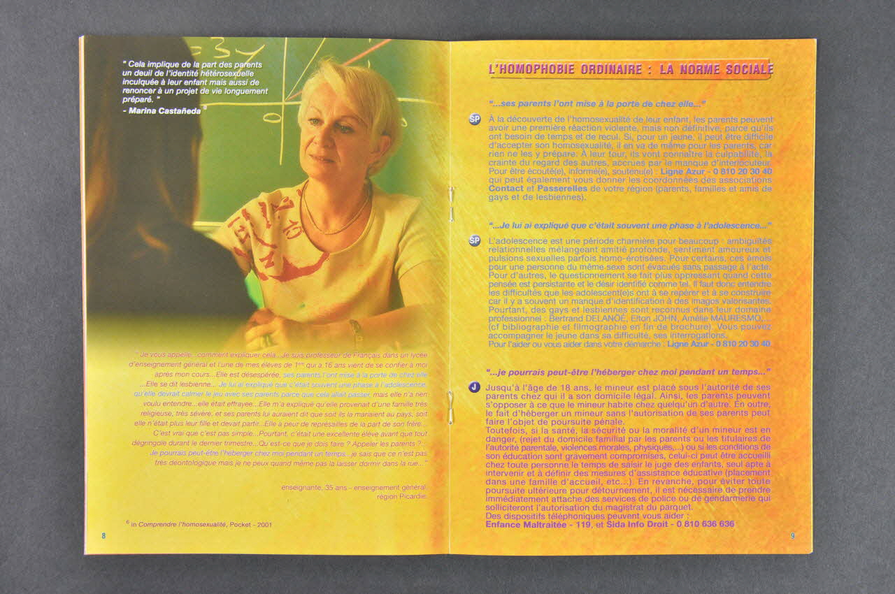Contenu de la brochure : - p.3 Pourquoi cette brochure ? (... )Depuis plusieurs années, la Direction Générale de la Santé, dans le cadre de la lutte contre le sida, se préoccupe des répercussions de l'homophobie sur le comportement préventif des jeunes gays et lesbiennes" Importance de l'éducation à la sexualité à l'école. - p.4 Pleine page : dessin de Cunéo : homophobie à l'école - p.5 Sommaire - p.6 L'homophobie ordinaire : des mots qui font mal : l'injure / la souffrance psychique / la discrimination au travail (Commentaires de citation) - p.8 L'homophobie ordinaire : la norme sociale : le rejet par la famille / une phase à l'adolescence / l'hébergement des mineurs - p.10 L'homophobie ordinaire : les violences vécues : le coming out / l'homophobie intériorisée / la sanction des violences - p.11 L'homophobie ordinaire : l'estime de soi et la santé : l'estime de soi / la prévention face aux IST / la notion de majorité sexuelle - p.14 Bibliographie, filmpographie, références juridiques.