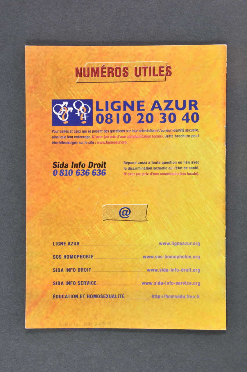 - édito // - sommaire // - l'homophobie ordinaire : des mots qui font mal // - l'homophobie ordinaire : la norme sociale // - l'homophobie ordinaire : les violences vécues // - l'homophobie ordinaire : l'estime de soi et la santé // - bibliographie / filmographie // - références juridiques // - numéros utiles (sur la page 5), à l'intérieurNom d'association