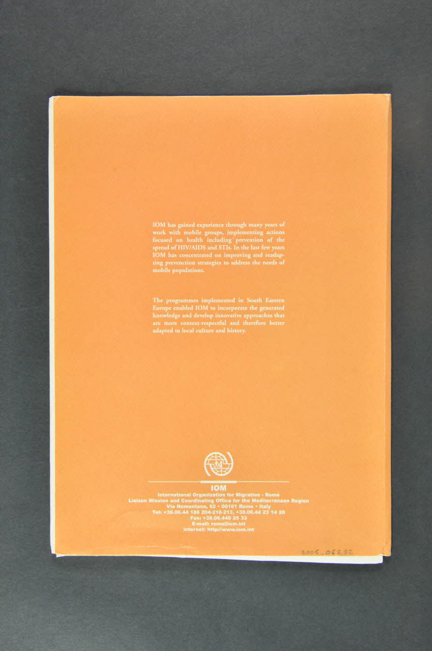 A propos des trois illustrations de la couverture : En dessous, photo de trois couvertures de rapports : "HIV/AIDS. Prevention and care among mobile Groups in the Balkans" (2005.062.05), "Overview of HIV/AIDS in South Eastern Europe" (2005.062.12), "Photo Album HIV & AIDS Prevention" (2005.062.04).