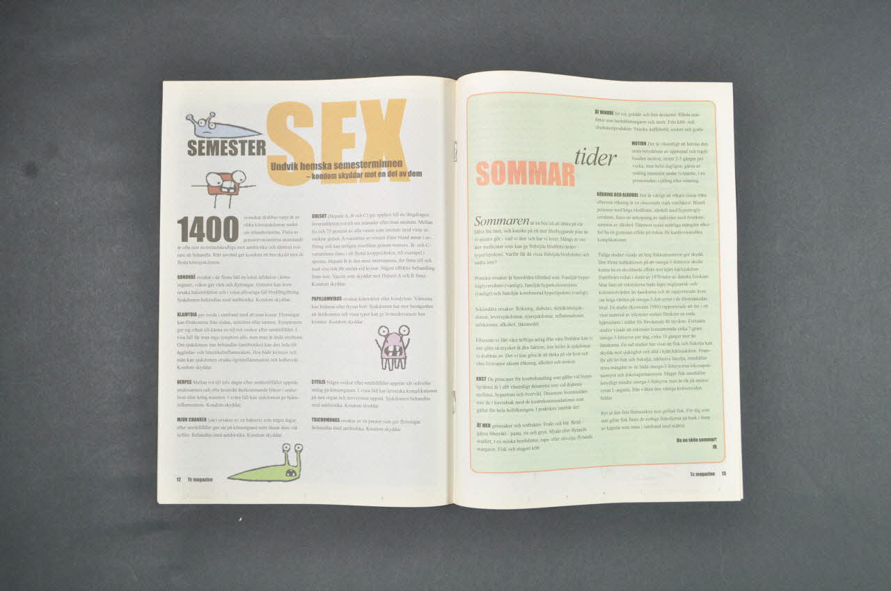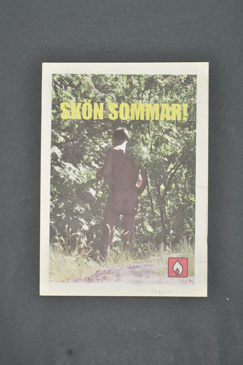 La couverture est en couleur. Il s'agit d'une photo en couleur encadrée de rose avec le titre du magazine en rose (à droite) et la date de parution en vert, jaune et rose (en haut). Sur la photo on peut voir un cerf-volant et la mer devant un soleil couchant. Au dos de la revue se trouve une photo. C'est un homme nu de dos dans la forêt. En haut en jaune il y a une phrase en suédois. En bas on peut voir le logo de l'association. A l'intérieur, les pages sont imprimées sur du papier journal en noir et en couleur, avec des illustrations, des photographies, et des encarts en gris.Inscriptions