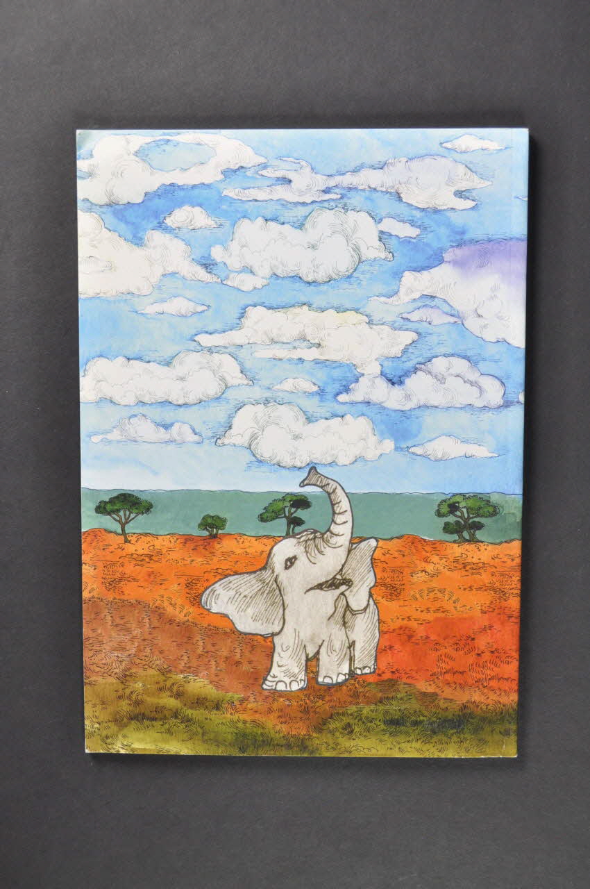 Le livret a 64 pages reliées par thermo-collage. Sur la couverture il y a en haut le nom des auteurs, en dessous le titre. La couverture porte un dessin de savane avec une jeune fille entourée d'éléphants qu'elle caresse. Au dessus de sa tête il y a un ciel bleu avec des nuages et trois éléphants sur un des nuages. Au dos il y a le même paysage avec un éléphant.Inscriptions