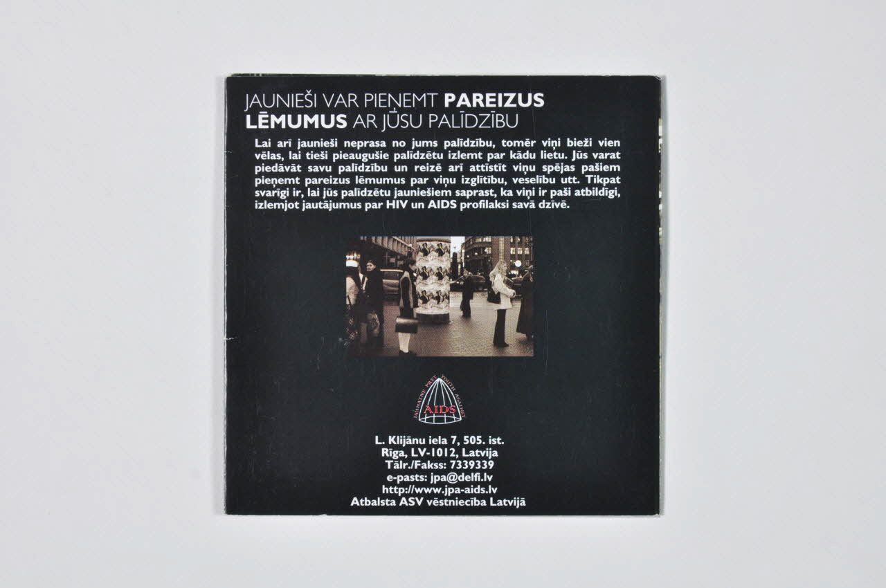 RUNAJOT AR // JAUNIESIEM PAR HIV/AIDS // // VISLIBAKAIS IEROCIS CINA // PRET AIDS IR IZGLITIBA // // PADOM, KA UZSAKT SARUNU // // JAUNIESI VAR PIENEMT PAREIZUS // LEMUMUS AR JUSU PALIDZIBU // // // HIV/AIDS, UN AR TO SAISTITAS TEMAS (Au dessus des textes.), à l'intérieurLogo, adresse, nom d'association