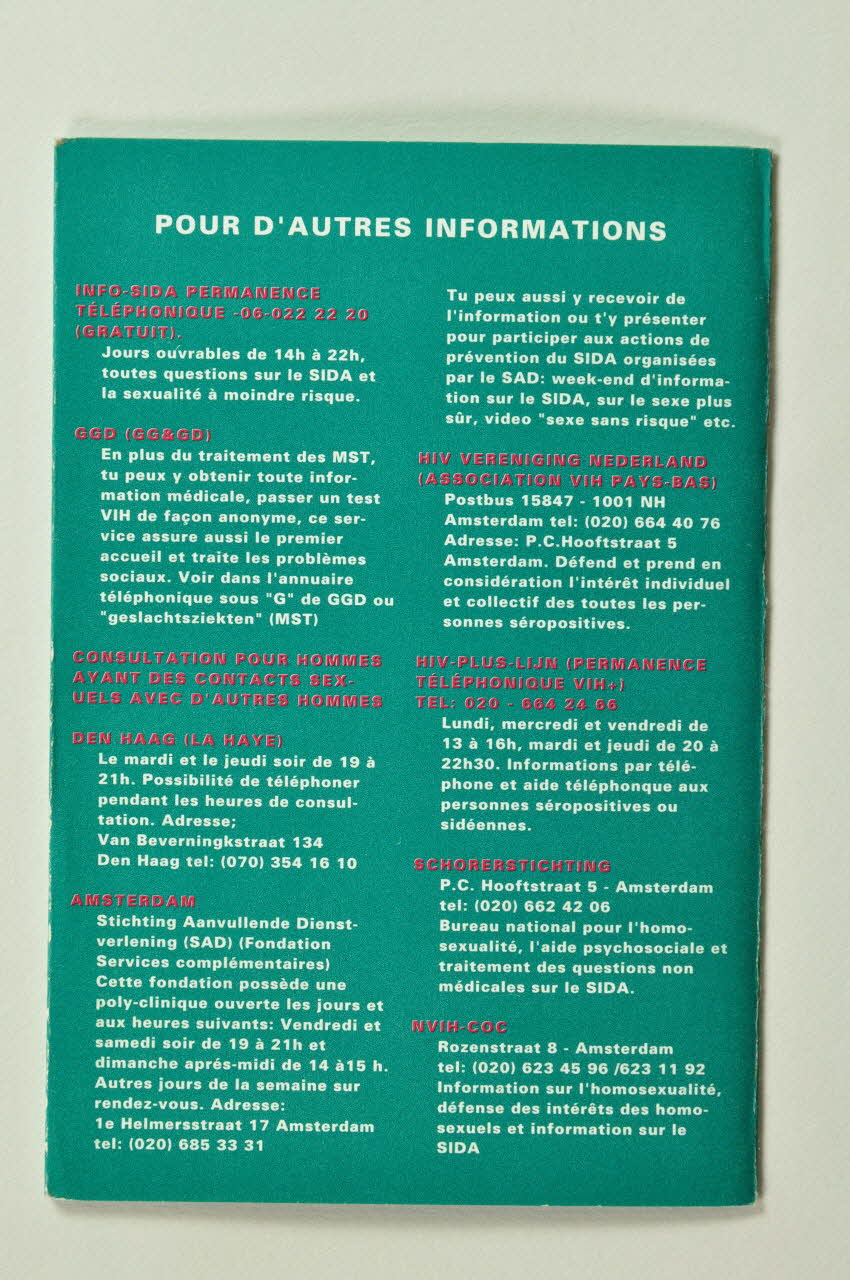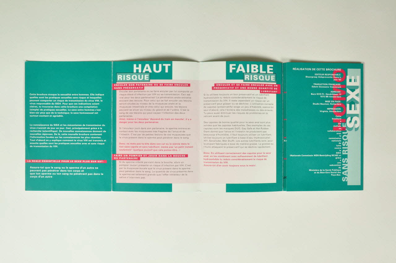 La brochure est faite en papier et est composé de cinq volets avec un fond vert. La couverture présente des inscriptions à droite en capitales rouges puis en vert clair, puis blanches sur bandeau vert clair. A gauche il y a un petit "F" noir dans un ovale blanc encerclé de rouge. Le dos a un fond vert avec des impressions en blanc en deux colonnes et les sous-titres en rouge. L'intérieur a des inscriptions en blanc avec les titres en noir et rouge, sauf dans trois pages où un carré rose est placé au fond, et dessus les textes sont en noir et les titres sur un bandeau rose et en blanc. Le contenu de la brochure traite des risques de transmission du VIH.Inscriptions