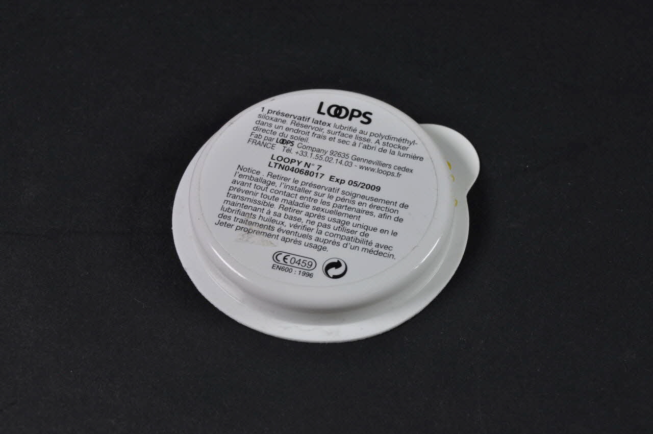 Capsule de plastique ronde contenant un préservatif LOOPS. Fond brun imitant la peau du tigre. Au revers adhésif avec toutes les indications techniques.Décor