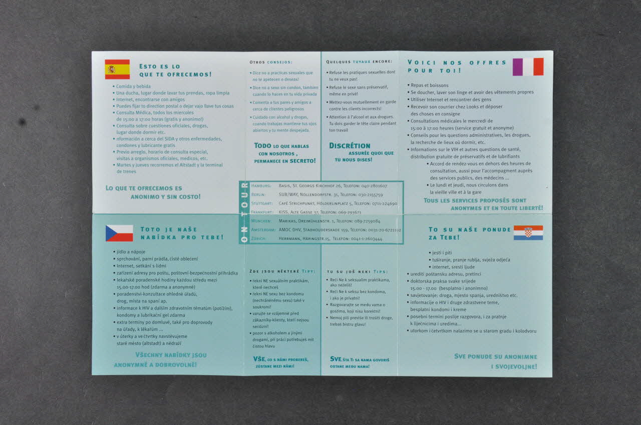 Il s'agit d'un dépliant pour une maison d'accueil pour les jeunes migrants prostutués. / Au centre, adresses à Hambourg, Berlin, Stuttgart, Francfort, Munich, Amsterdam, Zurich.
