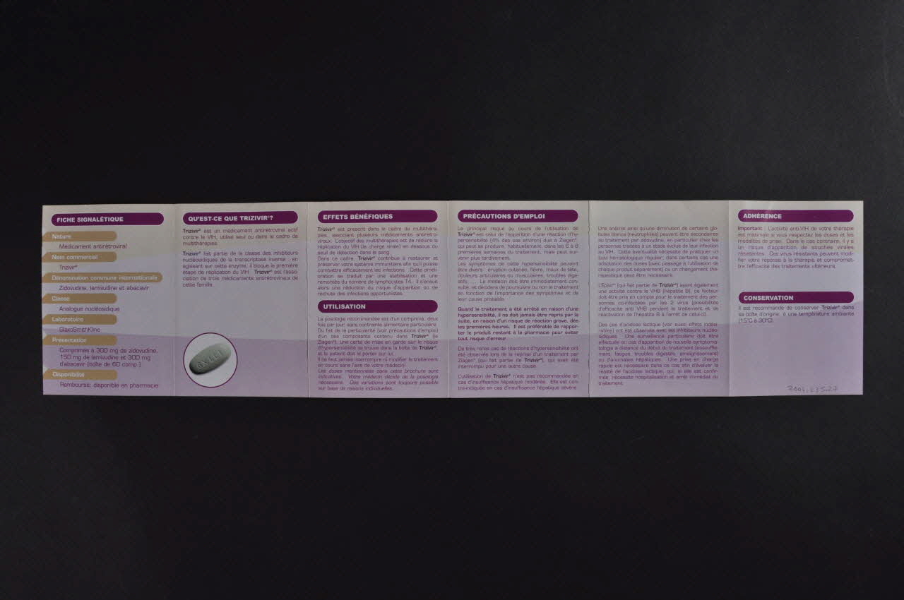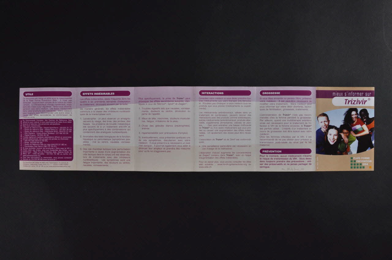 Mieux s'informer sur Trizivir (Titre du dépliant imprimé sur la couverture.)Fiche signalétique // Qu'est-ce que Trizivir ? // Effets bénéfiques // Utilisation // Précautions d'emploi // Adhérence // Conservation // Effets indésirables // Interactions médicamenteuses // Grossesse // Prévention // Utile (Titres des rubriques présentes dans le dépliant.)PLATE-FORME / PREVENTION / SIDA (Nom de l'association imprimé en bas à droite de la couverture.)Décor