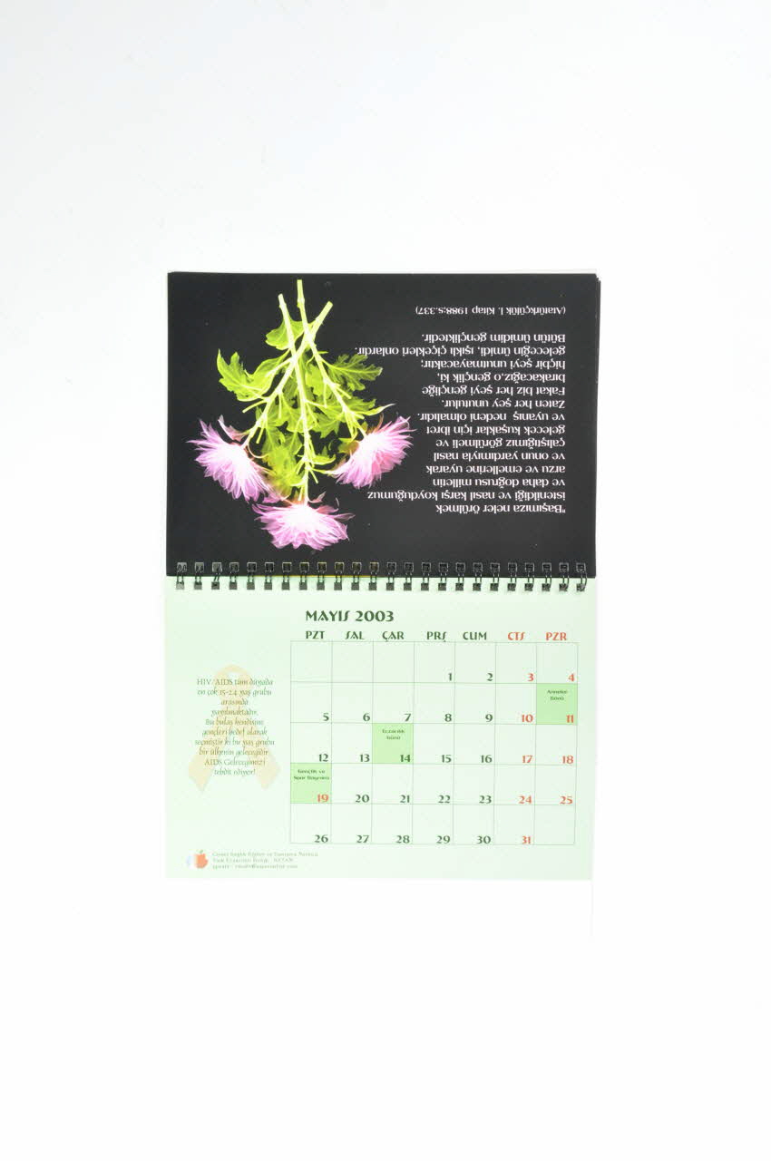 Calendrier en langue turque de forme rectangulaire dont les différentes feuilles sont maintenues en partie supérieure par des anneaux métalliques. Au dos se trouve une armature en carton blanc permettant au calendrier de tenir debout.