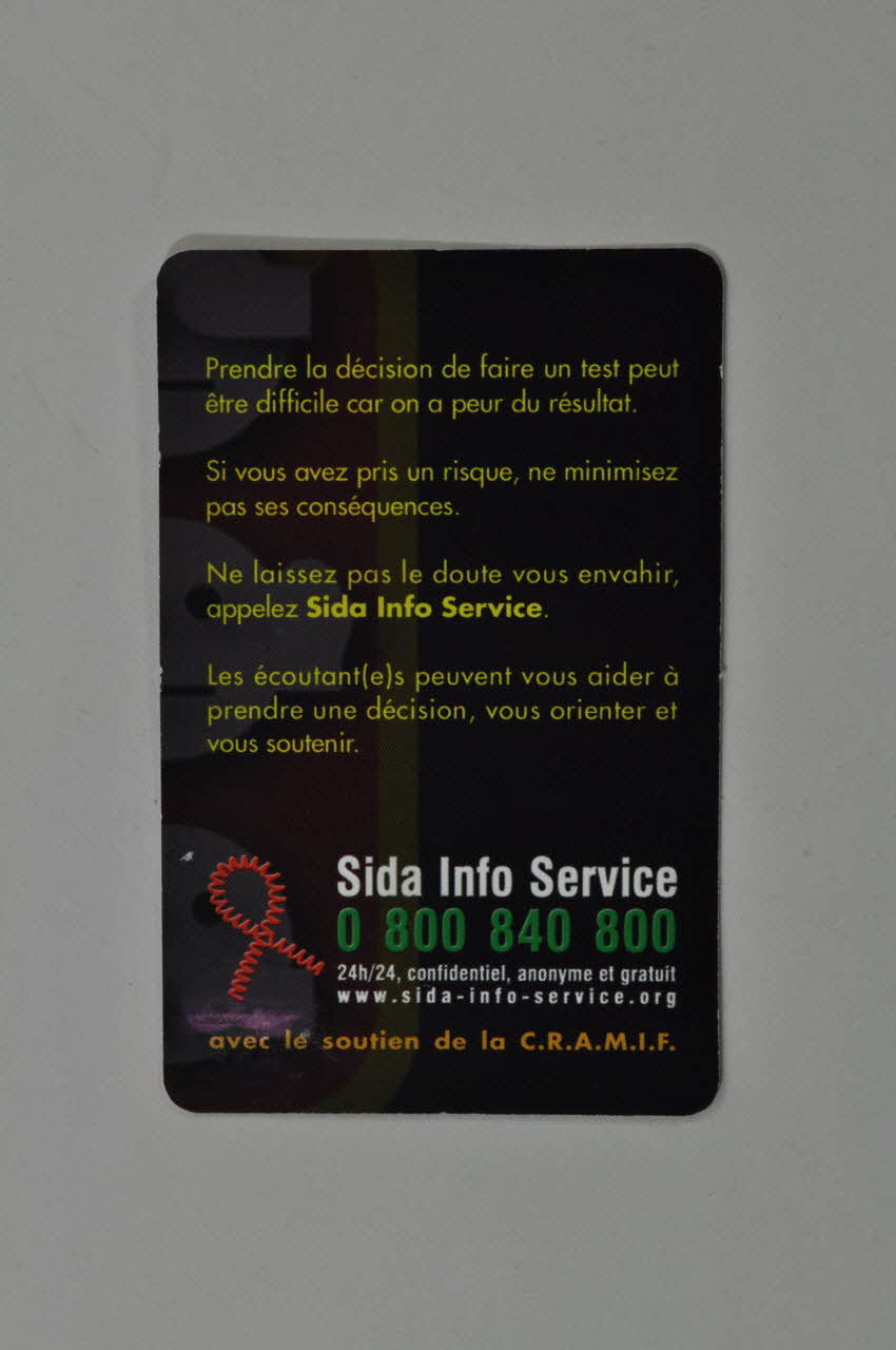 Sida Info Service // 0 800 840 800 // [...] (Au coin inférieur droit, le logo avec ses coordonnées comporte le ruban rouge symbole du sida. // Au verso, le même logo est même présent qui occupe sa partie inférieure.), rectoDécor