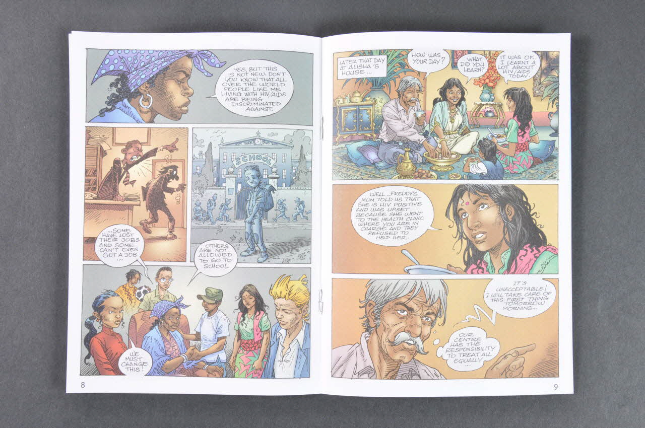 HIV/AIDS (inscription figurant dans le pgylactère au dessus du groupe de jeunes), sur la couvertureLogo
