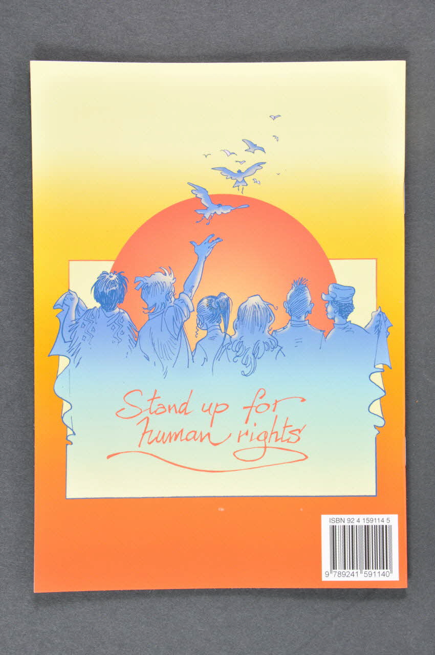 Stand up for human rights (inscription sur la banderole tenue par le groupe de jeunes), sur la couvertureDécor