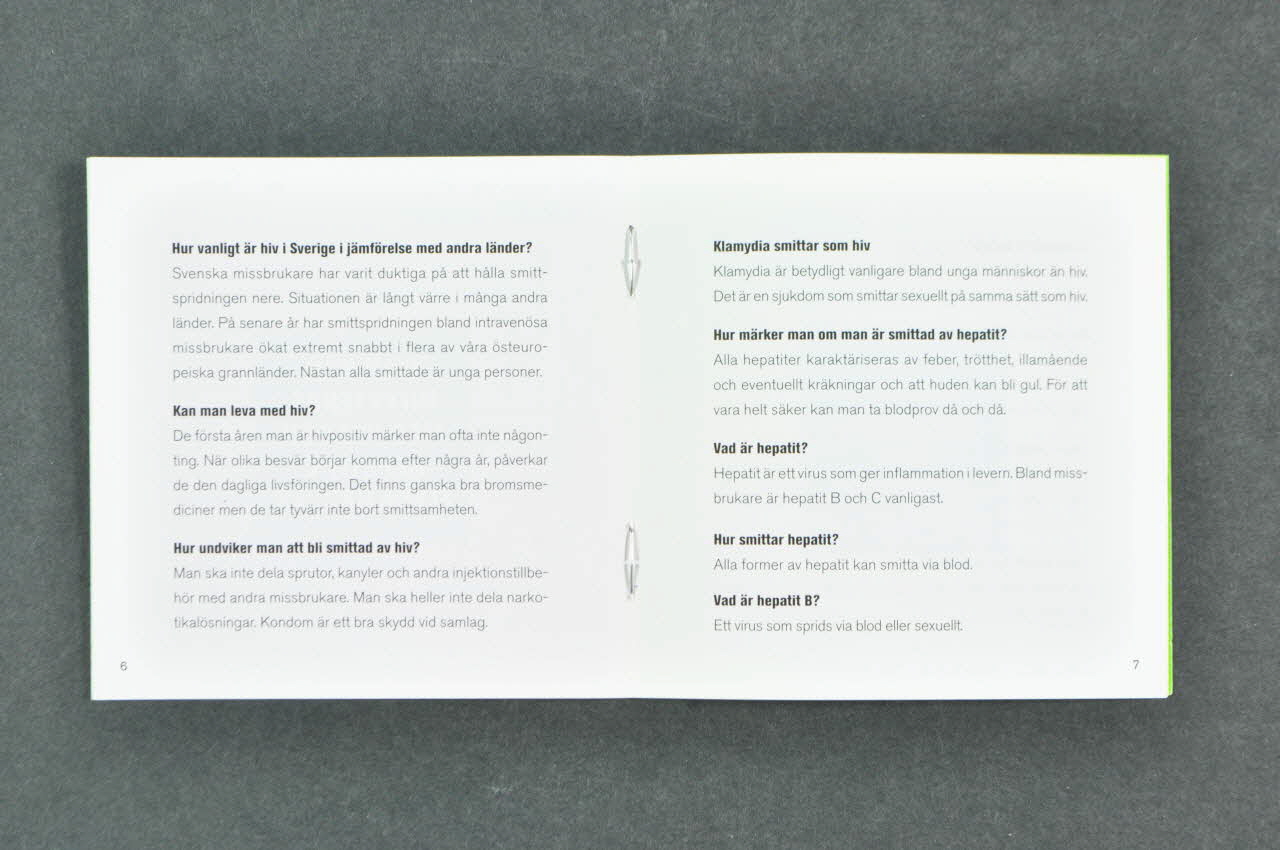 " Hur vanligt är hiv i Sverige i jämförelse med andra länder ?" / "Kan man leva med hiv ?" / "Hur undviker man att bli smuttad av hiv ? " / "Klamydia smittar som hiv" / "Hur märker man om man är smittad av hepatit ?" / "Vad är hepatit ?" / "Hur smittar hepatit ?" / "Vad är hepatit B ?" / "Är hepatit C farligt ?" "Hur smittar hepatit B ?" / "Vad är hepatit C ?" / "Finns vaccin mot hepatit B ?" (pages 6 à 8)Att dela narkotikallösning, uppdragskkärl, spruta, kanyl, kan sprida hiv och hepatit // HIV Smittar via samlag och blod // kondom skyddar (page 3)"Drogbrukare fär gratis vaccin" // "Man kan vaccinera mot hepatit B" (page 9)Om du vill testa dig vänd dig till :, verso"Är hepatit C farligt ?" / "Hur smittar hepatit C ?" / "Finns hjälp mot hepatit C ?" / "Finns hjälp mot hepatit C ?" / " Smittar hepatit C via samlag ?" / "Va fär man hjälp ?" (page 10)"Hur märker man om man är hivpositiv ? / "Kan man bli hivpositiv av sociala kontakter ?" / "Hur testar man sig för hiv ?" / "Kan hiv och hepatit smitta flera gänger ?" (page 4)"Hepatit C är vanligt bland missbrukare det finns behandling" // : "Man kan infekteras med HIV och hepatit C flera Gänger" (page 5)Sous-titre
