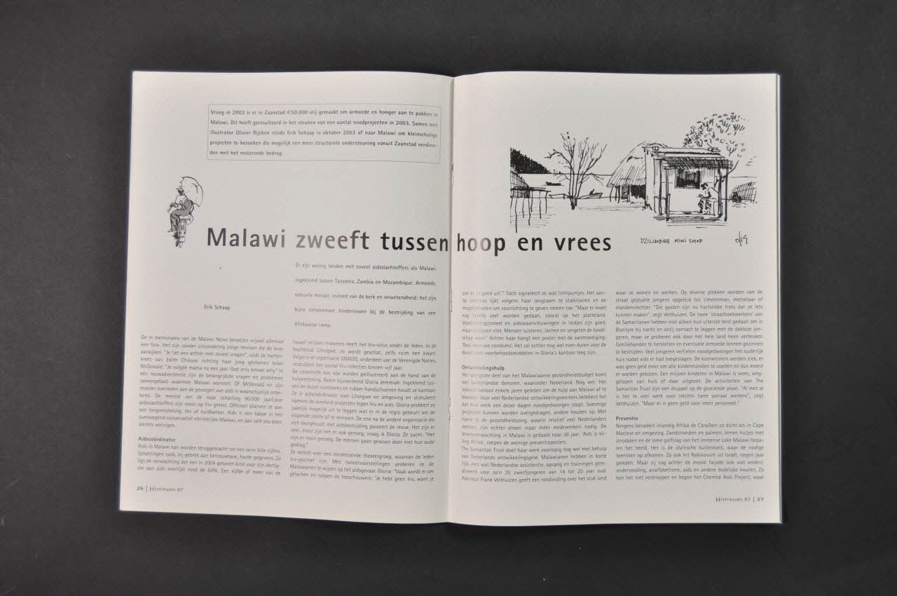 Revue de l'association HIV VERENIGING tirée à 2500 exemplaires. Traduire les titres. - p.4-7. De gaten in de hypotheekmarkt. (annonce en couverture) - p.8-10. Voor hiv-positieven blijft ons werk overeind staan. Aids Fonds en SOA Bestrijding fuseren (Interview sur la fusion des deux associations). (annonce en couverture) - p.11 Medereizigster. Lettre de lecteur ? - p.12-13. Het Servicepunt. La ligne téléphonique - p.14-16 Crimineel ! (Criminalisation du sida ?) Photos avec yeux bandés. - p.17 De spiegel - p. 18-19 Ron Wichmanhuis in gevaar - p.20-23 Preventie en zorg gaan hand in hand. SidaVida ondersteunt illegalen en asielzoekers - p.24, 29, 33 Brèves (sur l'Afrique et dans le monde) - p.25, 46 Verenigingsnieuws. Nouvelles de l'association - p.26-29 Malawi zweeft tussen hoop en vrees - p.30-32 Interview d'une femme séropositive du Surinam - p.33 BD Circus van de zon (exclusion d'un acrobate séropositif) - p.34-36 HIV in andere delen van het lichaam. Lieux de présence du virus dans le corps avec montages photographiques noirs et blancs. Cf illustration de la couverture et annonce en couverture. - p.37 Nieuws over entreeremmers - p.38-40 De kans op hiv-overdracht - p.40 Trial met preventief hiv-vaccin - p.41-43 Viral load - p.43 Medicinale marihuana in gevaar - p.44-45 Brèves sur les traitements - p.46-51 Activités de l'association et d'autres associations, agenda.