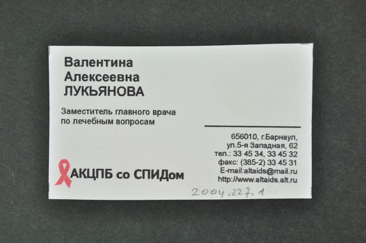 En haut, à gauche se trouvent des inscriptions en caractères noirs comportant le nom et la fonction du porteur de la carte. En bas, à gauche, se trouve un petit rouban rouge accompagné des inscriptions en caractères noirs. En partie inférieure, à droite, sont imprimés les coordonnées en caractères noirs. Les mêmes inscriptions et disposition sont présentées au verso en caractères cyrilliques noirs.Inscriptions