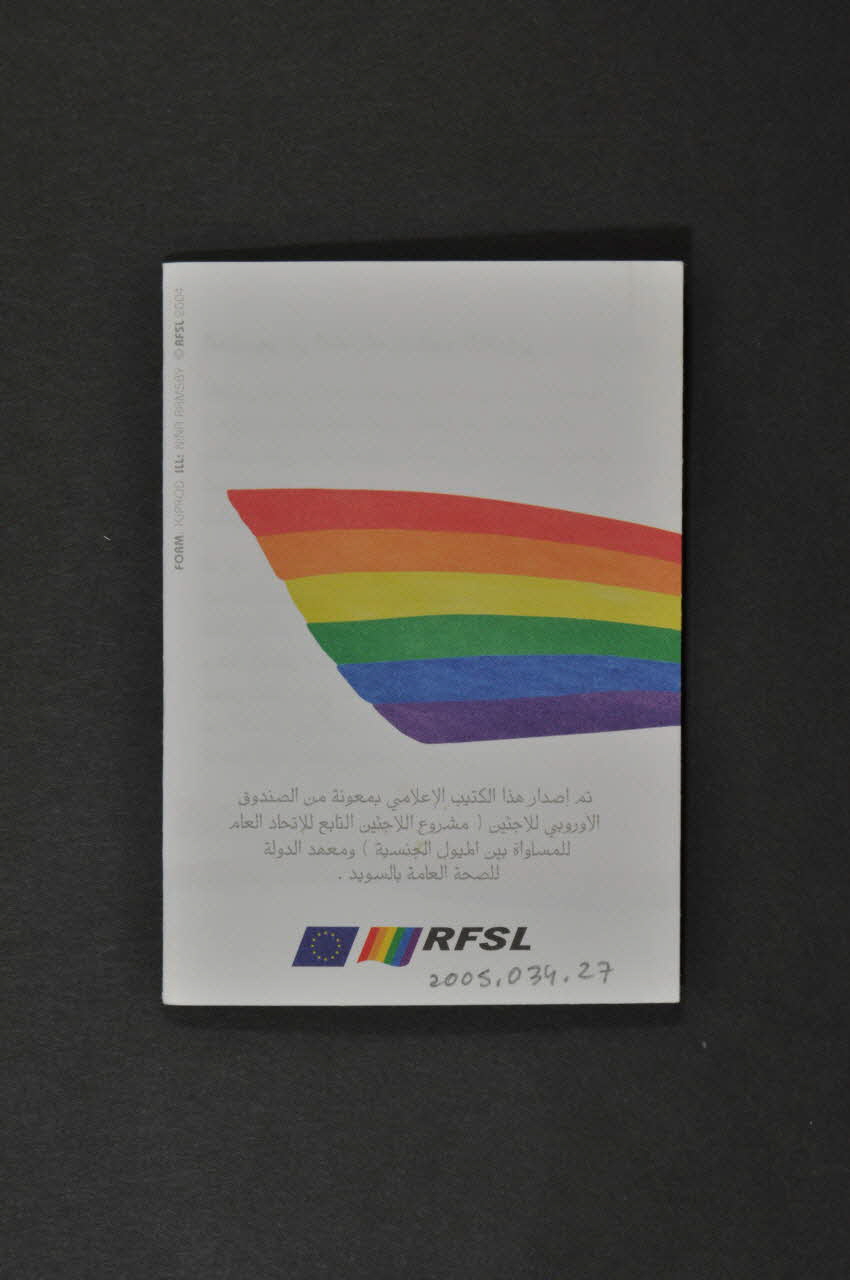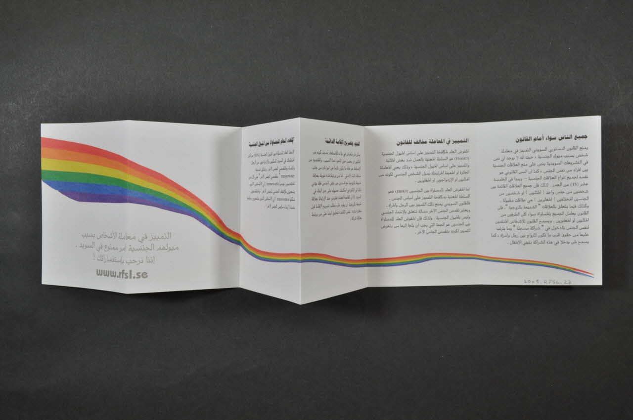 Il s'agit d'un petit dépliant en papier rectangulaire comptant six volets (soit douze faces). Imprimé en couleur, il laisse apparaître à la fois du texte (noir et gris sur blanc) en arabe et des illustrations ; en couverture : une main aux couleurs du drapeau homosexuel surplombe le sommet d'un globe terrestre où huit personnages se tiennent debout les bras levés. La Suède est mise en évidence par son drapeau. Le reste du document est parcouru par l'arc en ciel du drapeau homosexuel. Cet objet est la version arabe du 2005.34.24Inscriptions