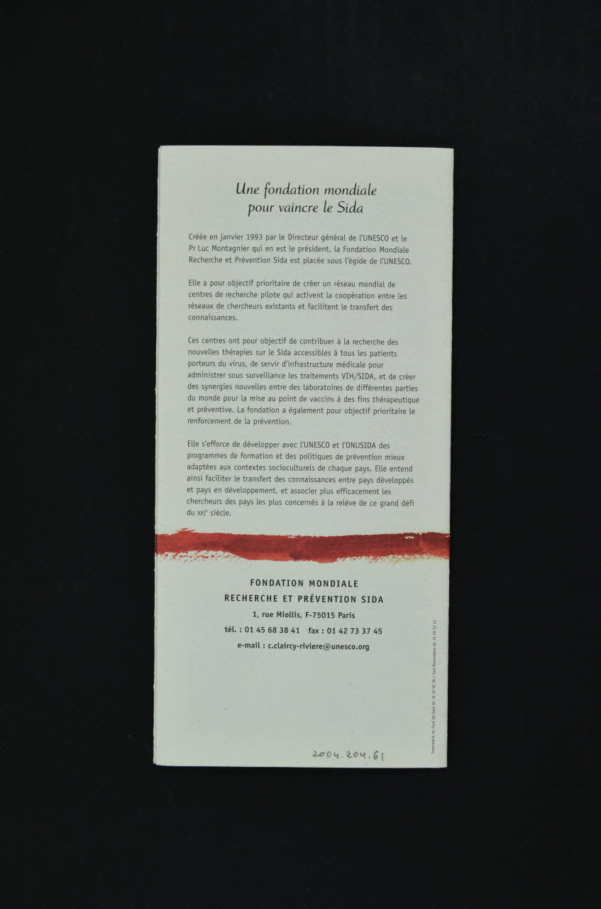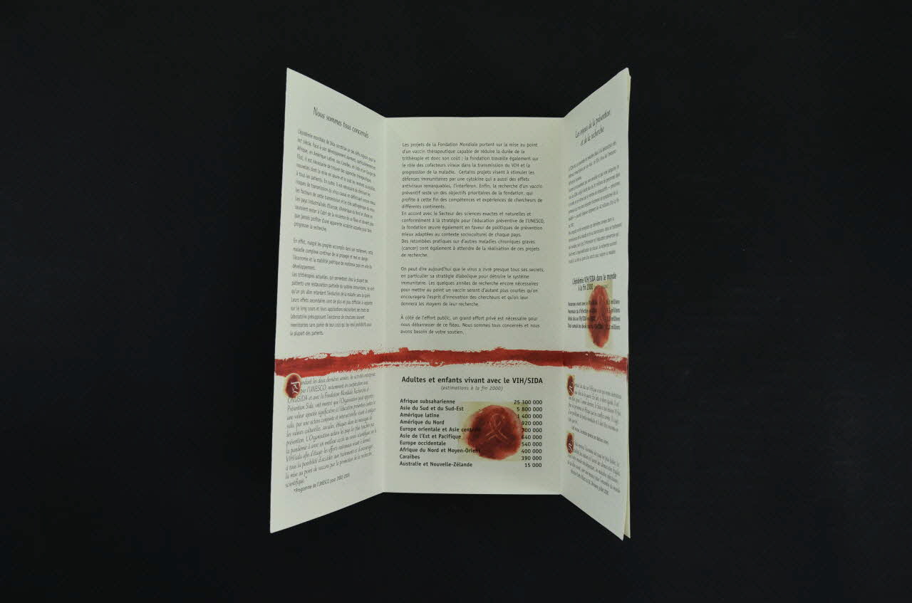 Feuillet 1. "Nous sommes tous concernés" (nord et sud) / L'UNESCO "peut apporter une valeur ajoutée significative à l'éducation préventive contre le sida par une action conjointe et intersectorielle visant à intégrer les valeurs culturelles, sociales, éthiques dans les messages de prévention." Feuillet 2. "Les projets de la Fondation Mondiale ... mise au point d'un vaccin thérapeutique capable de réduire la durée de la trithérapie et donc son coût... recherche d'un vaccin préventif... politiques de prévention mieux adaptées au contexte culturel de chaque pays" / Adultes et enfants vivant avec le VIH/Sida (estimations à la fin 2000) Feuillet 3. "Les enjeux de la prévention et de la recherche" / L'épidémie VIH/SIDA dans le monde à la fin 2002 / Citations de Kofi Annan et G8, juillet 2000. Feuillets 4 à 8 Présentation du "Centre Intégré de Recherches Biocliniques d'Abidjan (CIRBA)" Centre créé en avril 1996. Principales activités : Services médicaux : dépistage et traitement (traitements antirétroviraux) / Formation et éducation à la prévention (éducation par les pairs , formation de médecins) (4 photos) Feuillet 9 Bulletin de souscription. Feuillet 10 Propos de Luc Montagnier, Koïchiro Matsuura, directeur général de l'UNESCO, Peter Piot.