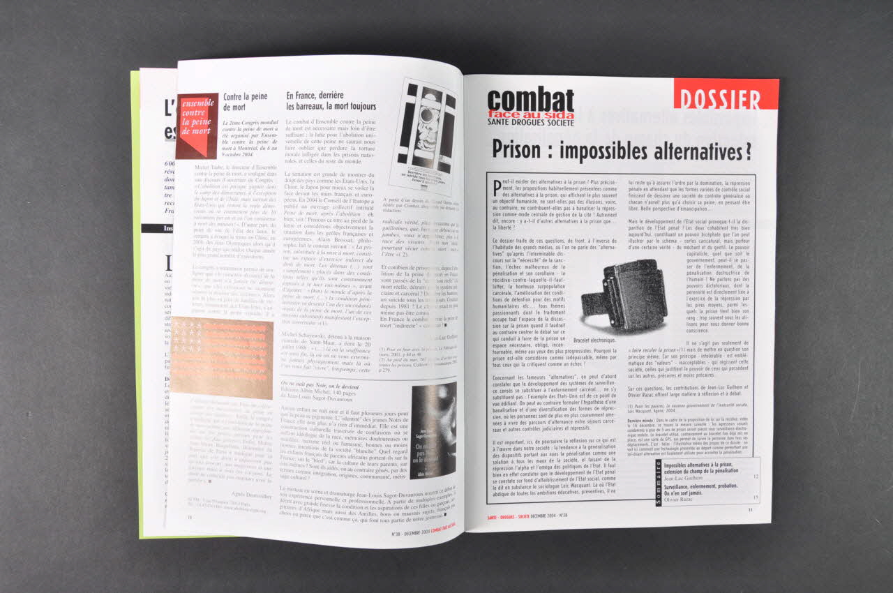 -p.5 Gilles Alfonsi : Une décision de l'INPES met en péril l'existence de Combat face au sida // -p.6 Institut de veille sanitaire : L'épidémie de sida en France est en recrudescence // -p.7 Reportage photo de Benoît Luisière : Ces regards qui éloignent la peur (enfants handicapés en Nouvelle Calédonie) // -p.10 Agnès Deurveilher : Contre la peine de mort // -p.10 Jean-Luc Guilhem : En France, derrière les barreaux, la mort toujours // - p.11 à 18 Prisons. Impossibles alternatives ? // p.12 Jean-Luc Guilhem : Impossibles alternatives à la prison, extension du champ de la pénalisation // p.15 Olivier Razac : Surveillance, enfermement, probation. On n'en sort jamais // -p.18 Laurent Jacqua Lettre d'un malade détenu aux parlementaires (Laurent Jacqua est l'auteur du dessin en couverture) // -p.19 Alban Lecuyer : 8h10 : embarquement pour Fleury-Mérogis // -p.21 Gilles Alfonsi et Jean-Luc Guilhem : Réduction des risques et contrôle social (suite) // -p.22 Philippe Denis : Vaccins contre le sida : entre espoir et confusion (page 4 (couverture prison), sommaire partiellement commenté)Introduction // Les femmes et le sida // Afrique Subsaharienne // Caraïbes // Asie // Europe orientale et Asie centrale // Amérique Latine // Océanie // Moyen-orient et Afrique du Nord // Amérique du nord, europe occidentale et europe centrale (page 3 (version femme indienne))Titre