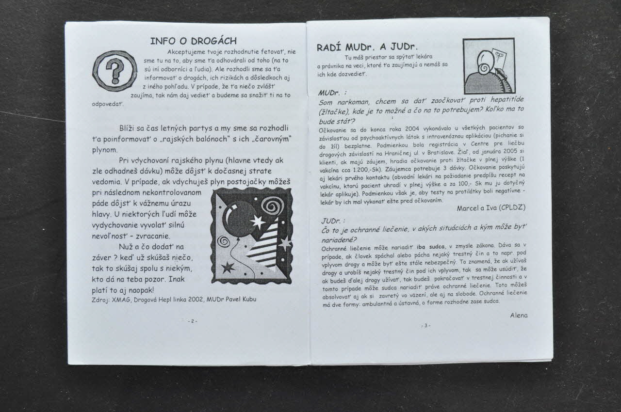 1. UVOdnik // 2. Info O drogach // 3. Radi MuDr. A JuDr (Informations médicales ou juridiques ??) // 4. Niecô na zamyslenie (citation de Vaclav Suplata) // 5. Predstavenie zariadenia, ktoré ti môze pomôct / Le service des Narcotics Anonymous. // 6. Drogova telenovela (présentation du LSD) // 7. Bezdomovecto na Slovensku (imprimé en noir sur blanc)Décor