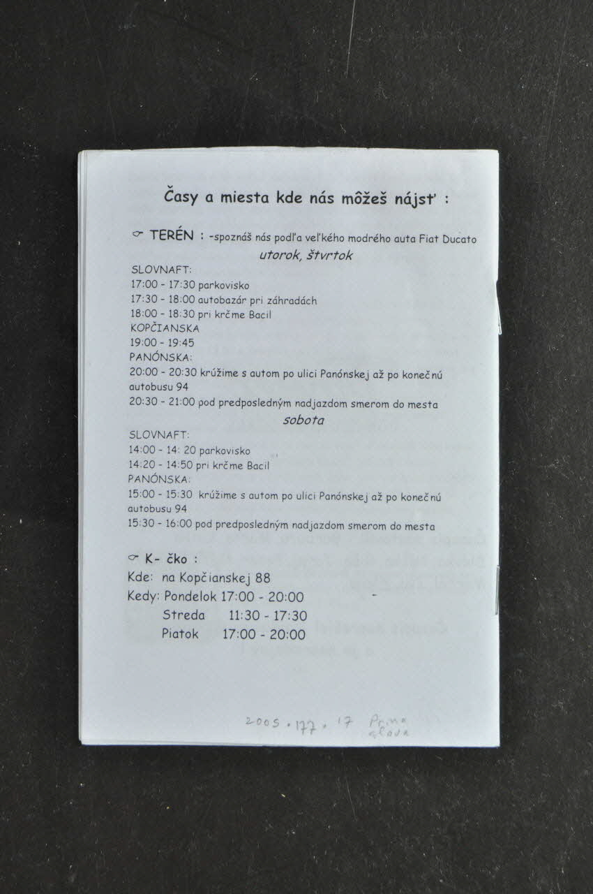 Casy a miesta, kde nás môzes nájst' // [...] (imprimé en noir sur blanc au dos)Sous-titre