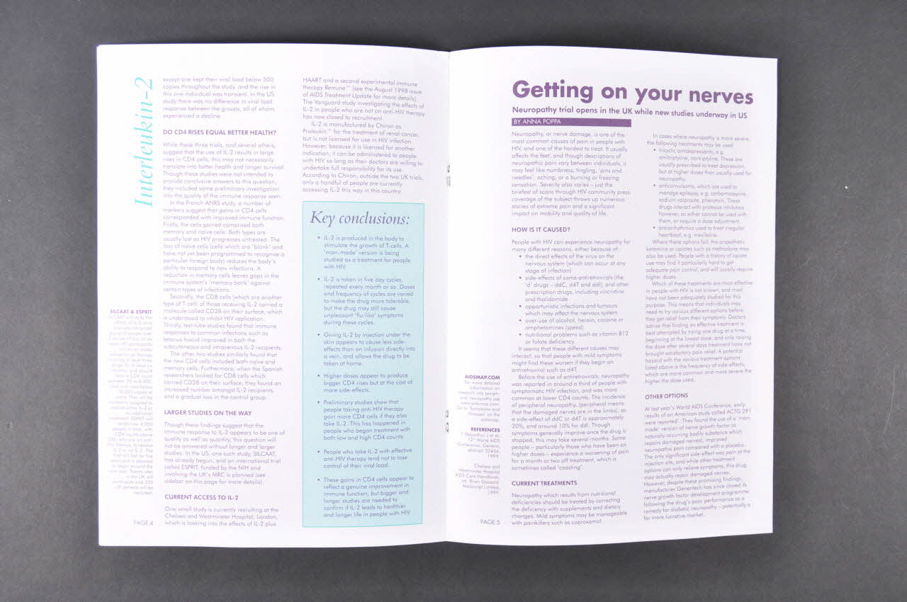 Sommaire détaillé, comménté et partielement traduit : - p.1-4 Interleukine 2. Essais de traitements pour booster le système immunitaire au Royaume Uni. - p.5-6 Essais cliniques sur le traitement des neuropathies périphériques. - p.6-7 Nouvelles brèves : Chute des taux de mortalité aux Etats Unis et au Royaume Uni / Interactions médicamenteuses / Nouveaux traitements / Neviparine pour les enfants / Rencontres et forums. - p.8 Glossaire / Coordonnées de NAM / Liste des sponsors.