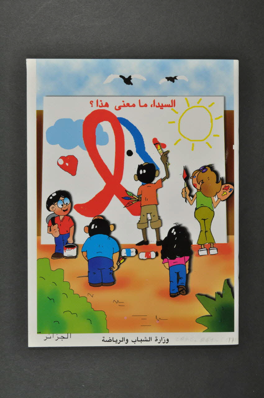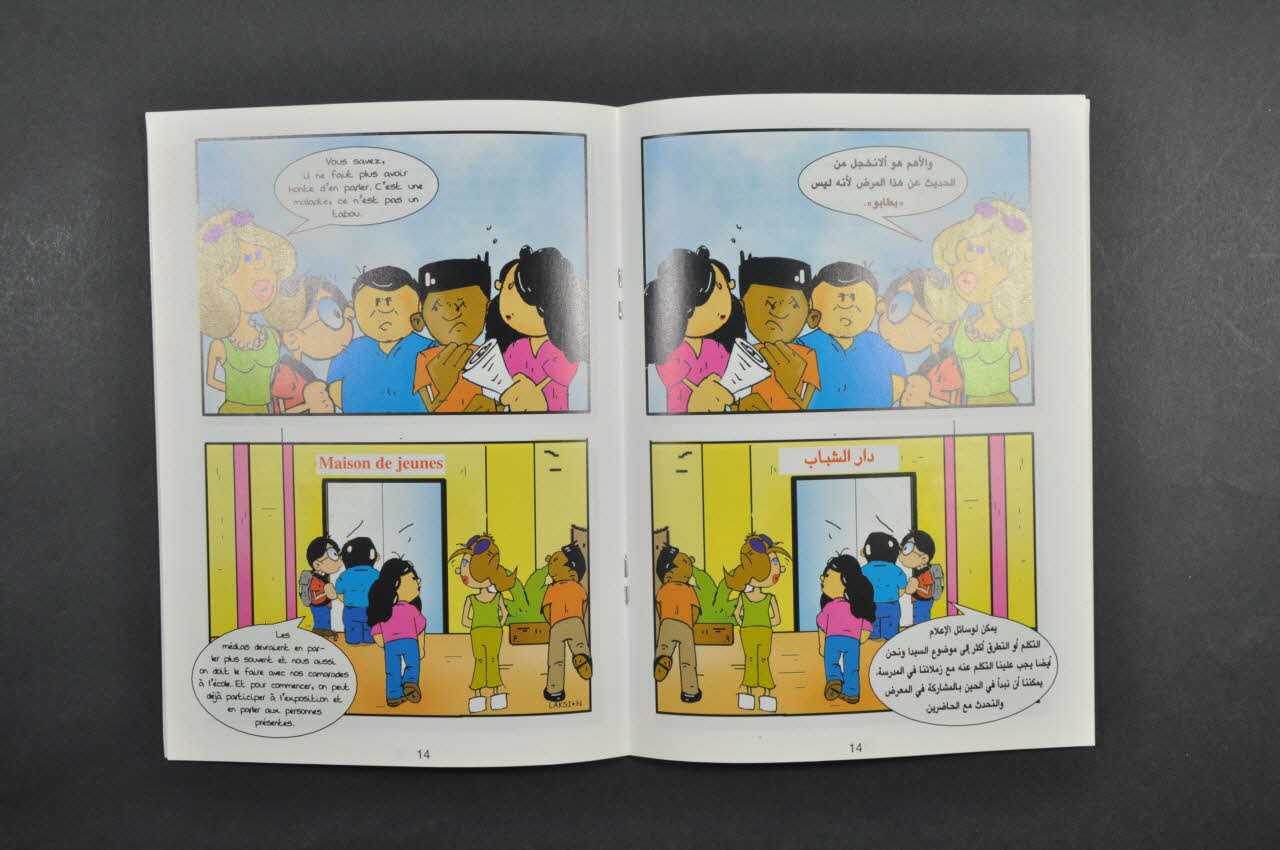 - Fille 1(Meriem) :"Vous avez vu le film qui est passé hier à la télé ? C'était affreux ! Il racontait l'histoire d'un jeune homme atteint du Sida" // - Garçon 1 (Sofiane) : "Le Sida ? C'est quoi ça ?" / Fille 2 (Sarah) :"Eh ! Sofiane, tu ne sais pas ce qu'est le SIDA ? Et pourtant la Maison de jeunes prépare une exposition sur le sida parce que demain c'est le 1er décembre, journée mondiale de lutte contre le sida". // - Meriem : "Justement, le journal d'aujourd'hui a publié tout un dossier sur le sida" // - Sofiane : "Mais, enfin, c'est quoi le sida ?" / Fille 2 :"Le sida, c'est une maladie qui peut nous faire souffrir toute la vie et après elle nous tue" // - Garçon 2 (Walid) : "Le sida est une maladie qui a causé des millions de décès. Si on ne fait pas attention il causera des dégâts dans tous les coins du monde." / Meriem : "C'est vrai, il est signalé dans le journal qu'à la fin 1999, 2,8 millions de personnes sont décédées à cause du sida et 34,3 millions d'individus vivent avec le VIH/Sida. Depuis le début de l'épidémie, 18,8 millions de personnes en sont mortes" // - Sofiane : "Dis-moi Meriem, cette maladie existe chez nous ?" / Garçon 3 (Mourad) : "Pourquoi tu t'inquiètes comme ça ? Le sida existe surtout à l'étranger, en Europe et en Amérique où il y a la prostitution et l'homosexualité. Nous, on n'est pas concerné" / // - Meriem :"Tu te trompes beaucoup Mourad. Le sida existe même en Algérie. Dans le journal ils disent qu'au 30 septembre 2000, il a été recensé 468 cas de sidéens" / Mourad : "Oui, mais ce sont tous des prostituées, des homosexuels et des drogués" // - Meriem :"Pas du tout, il n'y a que 18,59 % qui sont toxicomanes et 4,49 % qui sont homosexuels. Par contre, 37,82 %, c'est à dire la majorité, sont hétérosexuels et 10,04 % ont eu la maladie par transfusion sanguine" // - Mourad :"Mais tous ces gens sont des mécréants, des "pêcheurs". C'est un châtiment divin." // - Meriem : "Pas du tout, le sida peut se transmettre par des relations légitimes. De plus, ce n'est pas un châtiment car des nouveaux-nés peuvent être contaminés par la mère elle-même contaminée ou bien au moment de la naissance. Est-ce un châtiment pour ces enfants ?" / Sarah : "Comment on attrape cette maladie ?" // - Mourad : "Par les relations sexuelles illégitimes et sans limite" // - Walid : "C'est vrai, Mourad, le sida se transmet par voie sexuelle pendant les relations non-protégées quand un des partenaires est malade" / Meriem : "N'oublie pas, Walid, la transmission par la voie du sang comme les transfusions sanguines, les seringues déjà utilisées, les blessures..." // - Sofiane : "Est-ce que les moustiques peuvent transmettre le sida ?" / Sarah : "Il paraît qu'on peut l'attraper quand on sert la main à des sidéens ou par les WC" // - Meriem : "Mais non ! Le sida est une maladie causée par un virus qui est véhiculé par le sang et le sperme. Il ne peut pas vivre en dehors du corps humain." / Sarah : "S'il n'y a que cela, pourquoi les gens ont-ils peur du sida ?" // - Walid : "C'est parce que c'est une maladie mortelle et qu'on n'a pas encore trouvé de vaccin ni de médicaments" / Meriem : "Tu sais Sarah, il y a un traitement mais il coûte très cher même dans les pays développés et en plus il ne guérit pas la maladie, il ne fait qu'en retarder l'évolution : c'est la trithérapie. // - Sofiane : "Qu'est-ce qu'il faut faire alors ?" // - Mourad : "Il faut pratiquer l'abstinence !" // - Walid : "Ca c'est vrai pour les relations sexuelles, mais il y a aussi la fidélité, sinon on peut utiliser les préservatifs" // - Sofiane : "Mais, Walid, les préservatifs coûtent cher !" // - Meriem : "Il y a d'autres modes de prévention. Pour les transfusions sanguines, il faut contrôler le sang, chose qui se fait chez nous, et stériliser les seringues ou, ce qui serait encore mieux, d'utiliser des seringues jetables." // - Sarah : "Il ne faut pas utiliser les brosses à dents des autres et chez le coiffeur on doit systématiquement demander qu'il change les lames de rasoir." // - Sofiane : "Est-ce que le dentiste stérilise son matériel ?" / Meriem : "Normalement, tout le matériel médical doit être stérilisé. // - Walid : "Vous oubliez quelque chose d'autre, il y a aussi l'information qui aide à la prévention de la maladie." / Sarah : "On devrait avoir beaucouo d'émissions à la télé, à la radio, et surtout informer les jeunes dans les écoles." // - Walid : "Dis-moi, Sarah, om est-ce qu'on pourrait trouver toutes les informations sur le sida ?" / Sarah :"On peut en trouver au niveau des Maisons de jeunes, des Centres d'Information et d'animation de la jeunesse (CIAJ) ou alors appeler le numéro vert 116." // - Mourad : "Eh Meriem, toi qui sait tout, comment savoir si on est atteint du sida ?" // - Sofiane : "Je crois que c'est quand la personne devient très maigre !" // - Meriem : "Pas nécessairement, il y a des personnes porteuses du viru (Texte en noir au sein de bulles blanches.), à l'intérieur