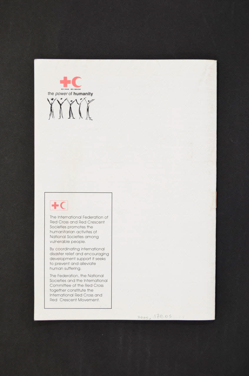 International Federation // of Red Cross and Red Crescent Societies. (L'inscription, en caractres blancs, figure dans la bande rouge, dans la partie inférieure de la première de couverture.), sur la couvertureDécor