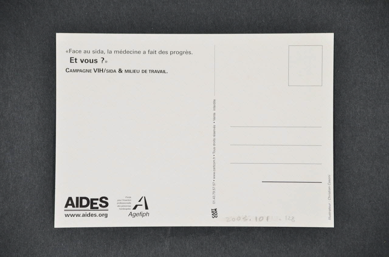 "LA REPONSE EST NON. QUELLE EST LA QUESTION ?" (Imprimé en capitales noires dans le haut à gauche), recto"Face au sida, la médecine a fait des progrès. // Et vous ?" // CAMPAGNE VIH/SIDA & MILIEU DE TRAVAIL. (Imprimé en noir sur blanc dans l'angle supérieur gauche), versoLogo